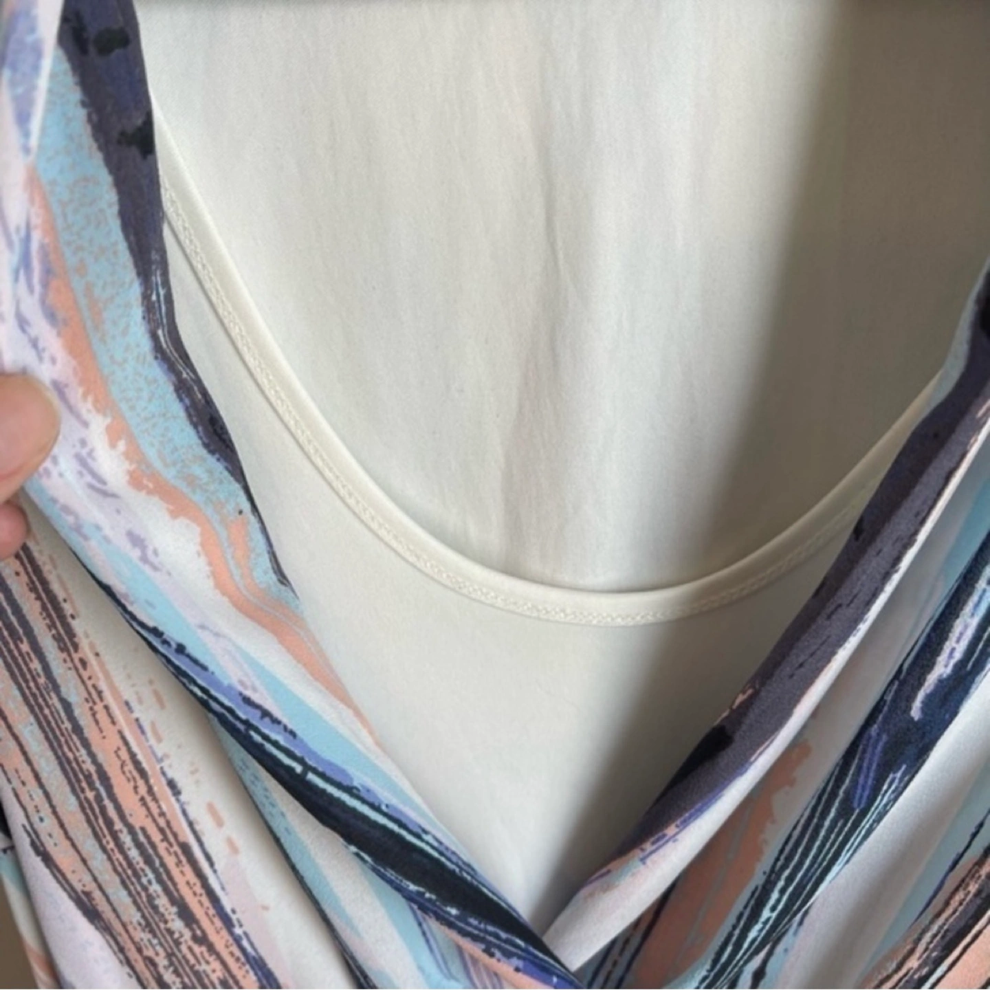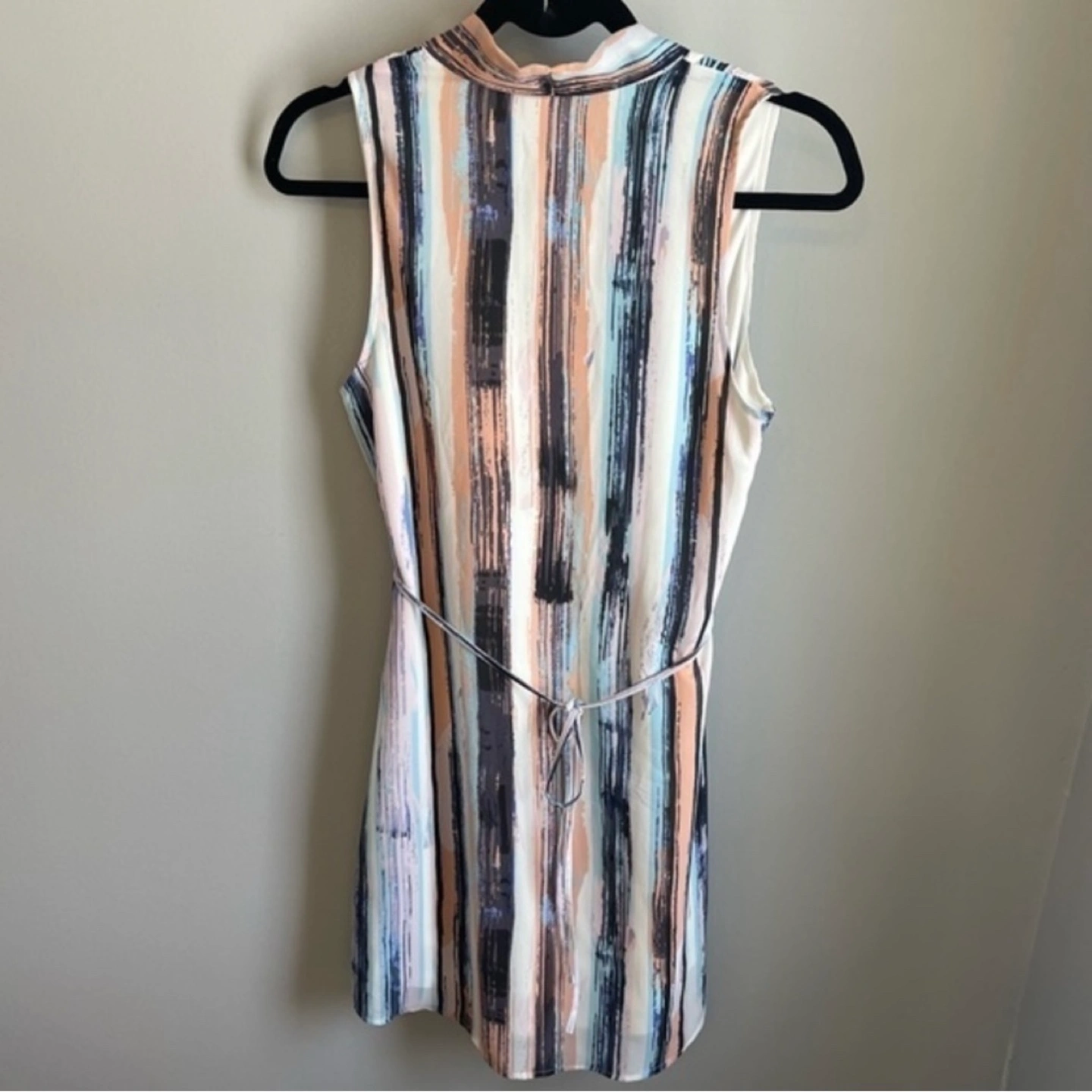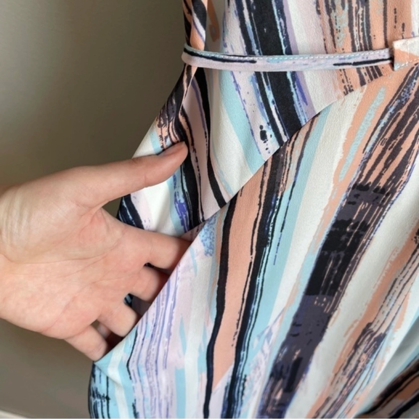 White with orange, blue and pink stripes. Lightweight shift dress from Dex. Front pockets and tie at waist. Fully lined. Surplice style neckline. Knee length. Sleeveless. Hardly worn. Women’s size S. See photos for measurements. Cross posted.