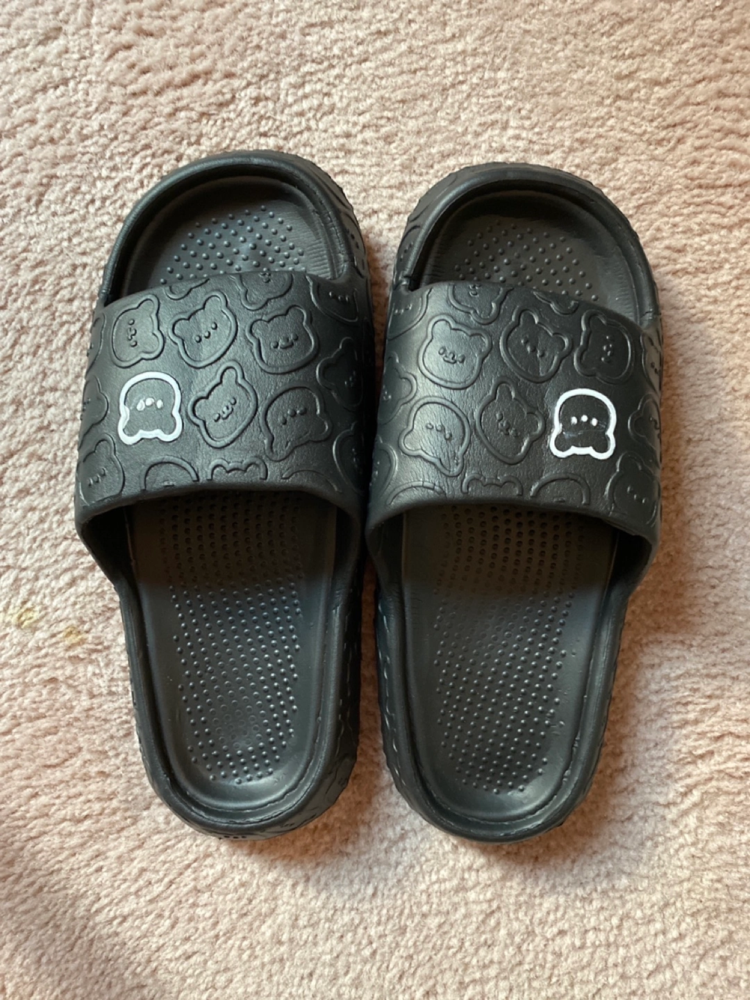 I'm selling a pair of slide sandals. The sandals are black. Features cute cartoon bears throughout. The footbeds are also textured, and will surely comfort you. Sliding into these after a long day is a great way to wind down.