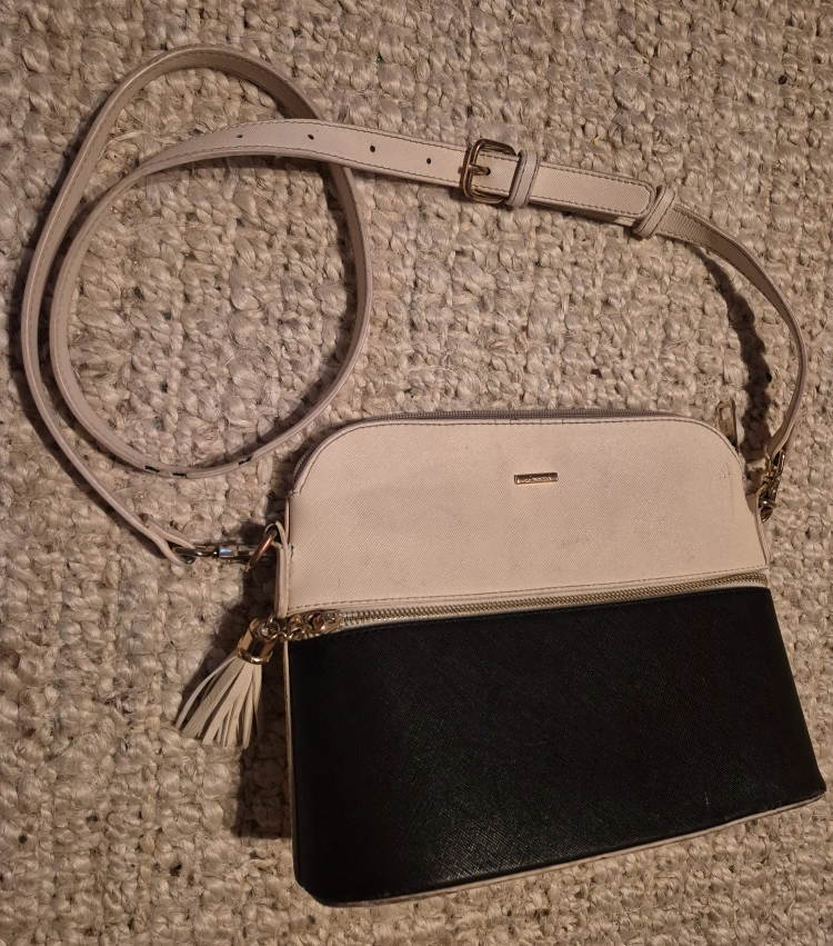 A creme + black crossbody bag. It features a long adjustable strap, and a zipper closure. The bag has a tassel detail on the side, the inside body is in good condition, all closures work great! She needs some TLC and proper loving care. Once cleaned up this piece will be nice, it will have minor damages as pictures along edges and strap. πŸ™ŒπŸ‘Œ FREE FREE FREE - Pick up in Kincardine ON.