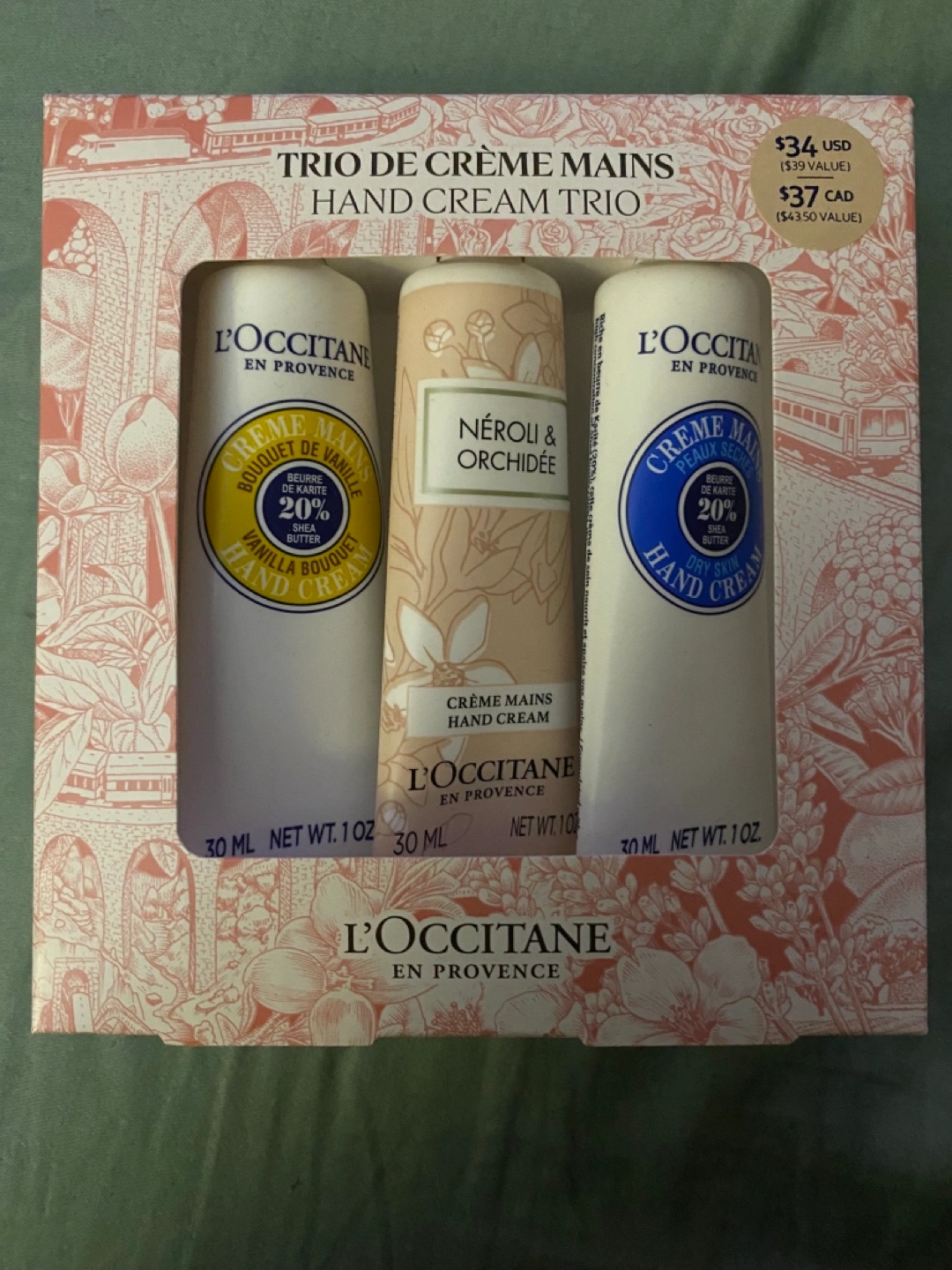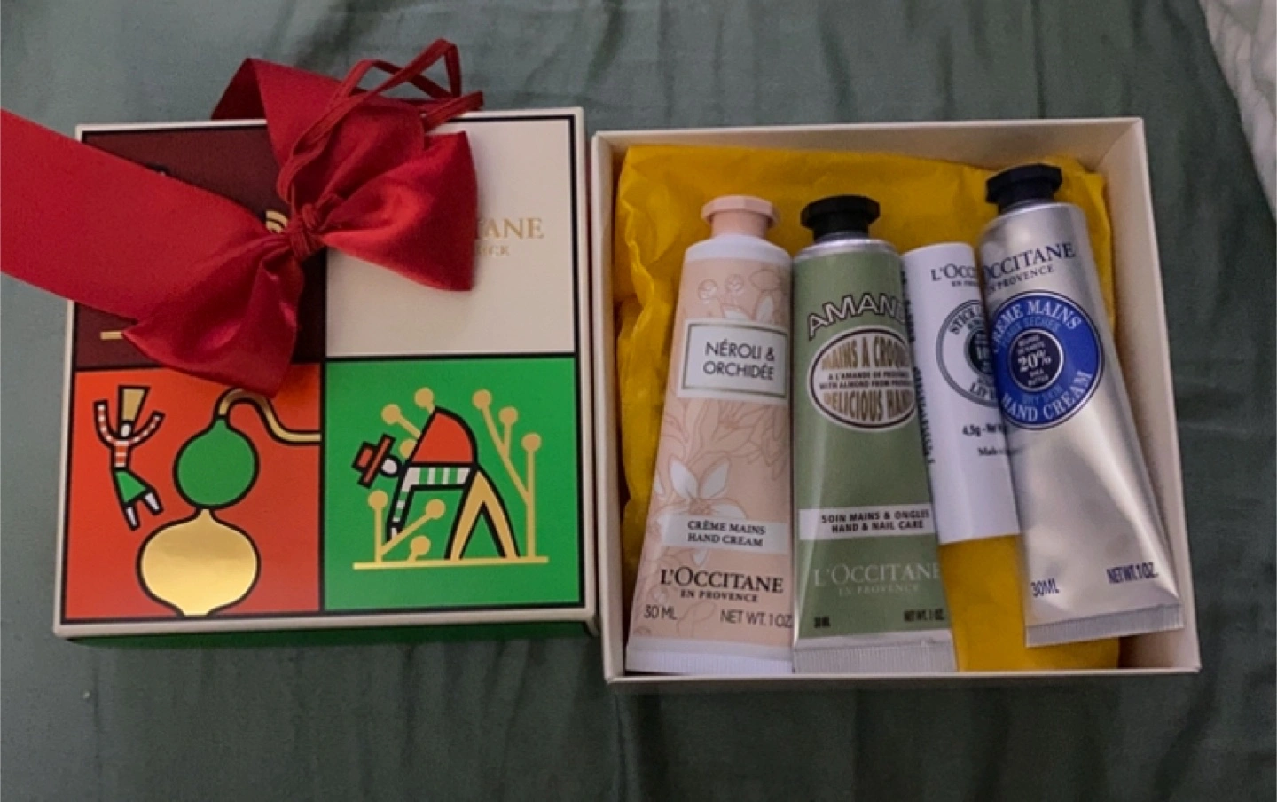 A lovely set of hand creams. Comes with a decorative box and a red ribbon. Perfect for a relaxing night in.