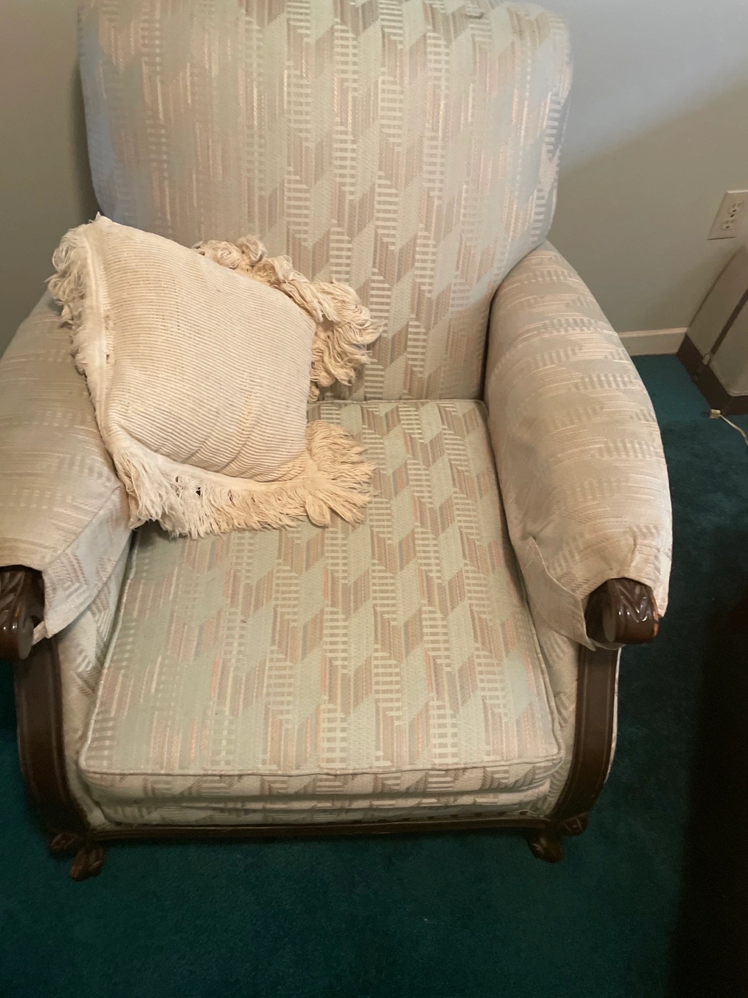 A patterned armchair with a matching pillow. The chair appears to have a wooden frame. The arms are carved. It would be a perfect piece for your reading corner.