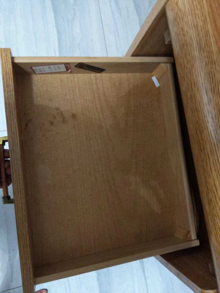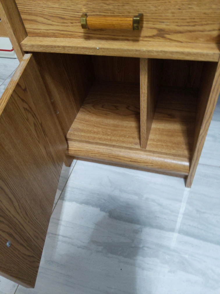 Cabinet with light brown finish. Features a door and a pull out shelf. Great for storing items in a safe space.