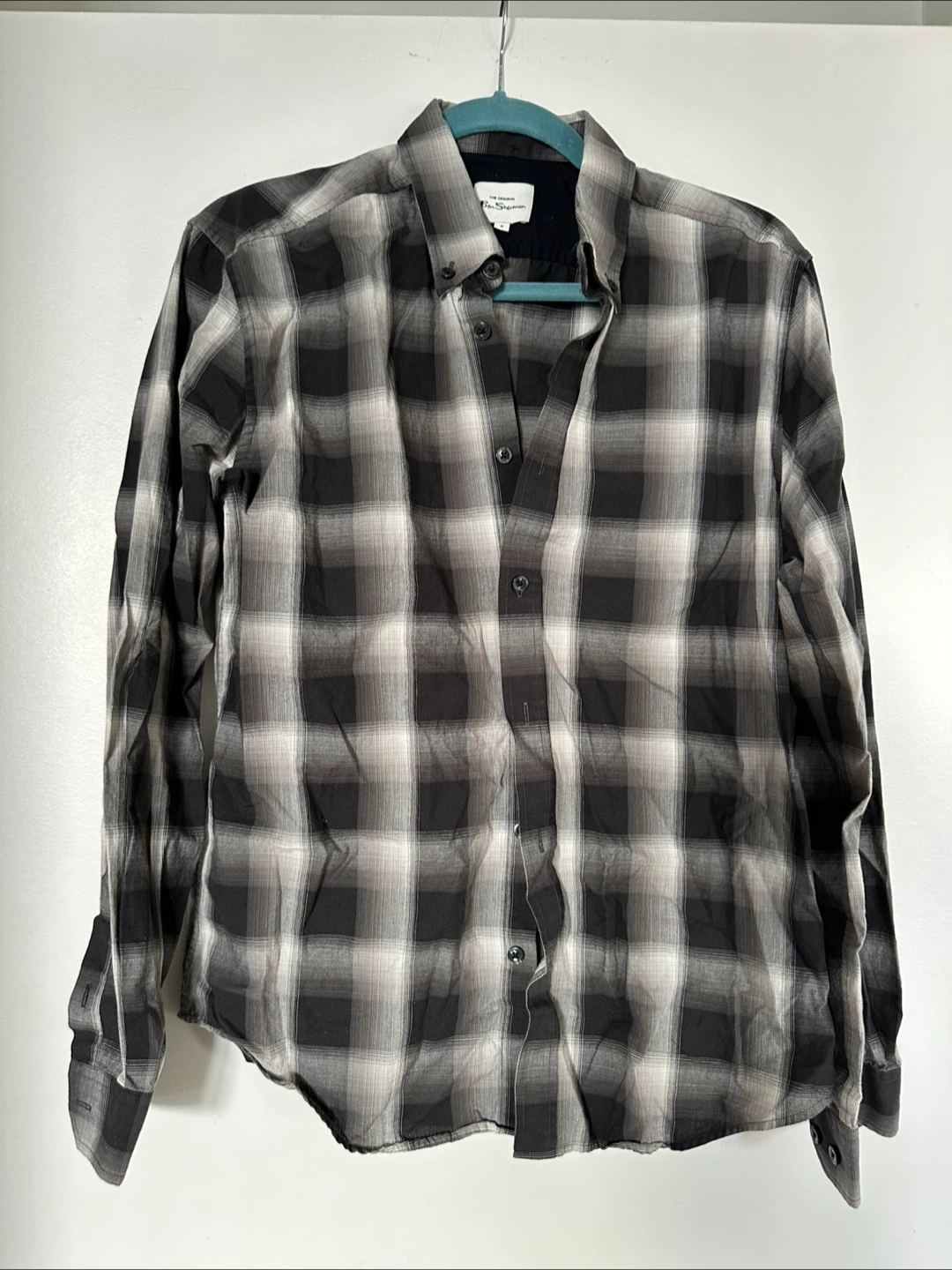 136Button-up shirt in plaid pattern. Long sleeves with buttoned cuffs. Has a collared neck. Perfect to wear on a casual outing.
