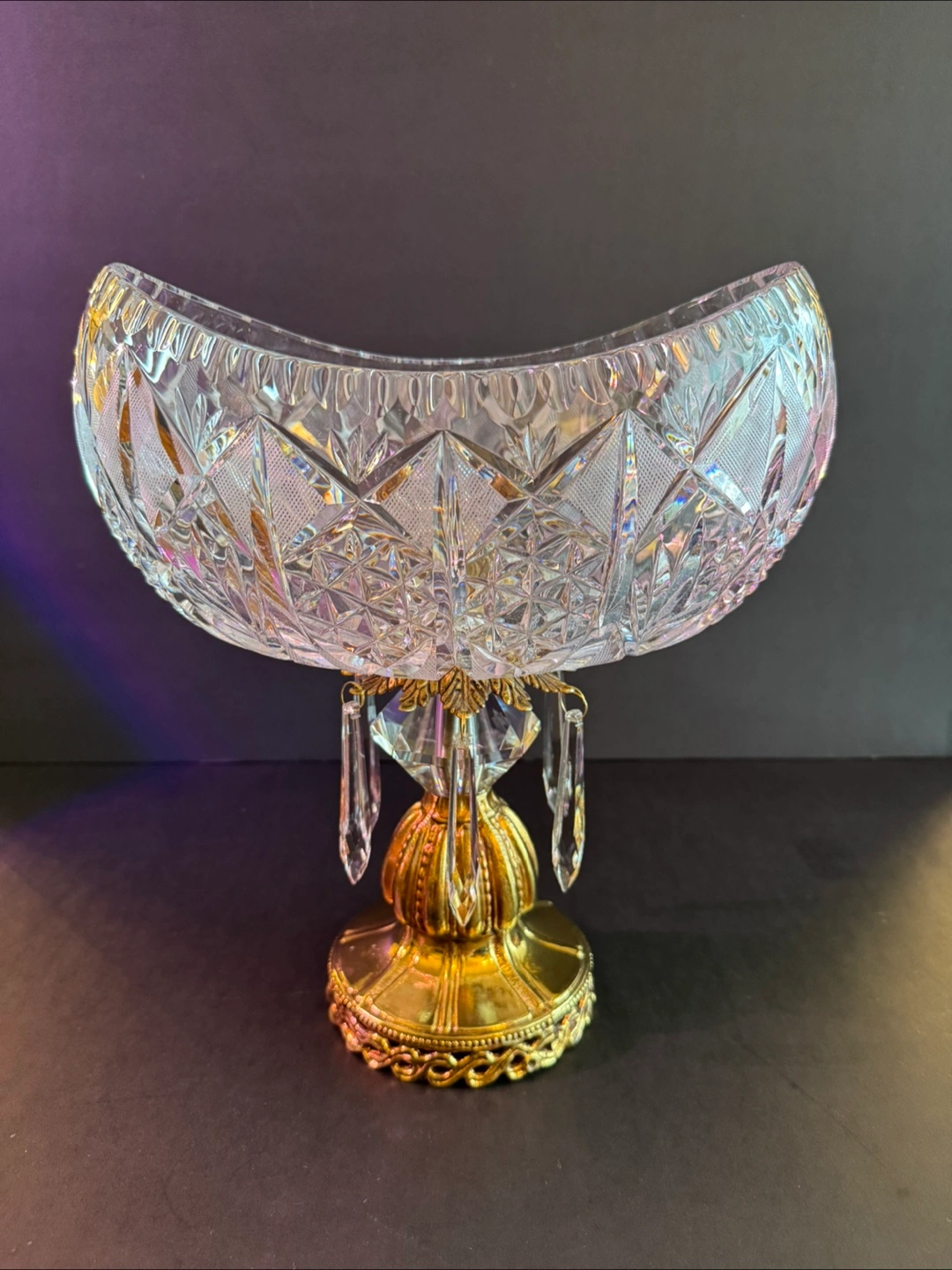 Elegant crystal bowl. Features intricate geometric designs. It sits upon a decorative gold-toned base with hanging crystals. You could use this bowl to hold your favourite snacks while relaxing.High 12 inch,Wide 10-6 inch