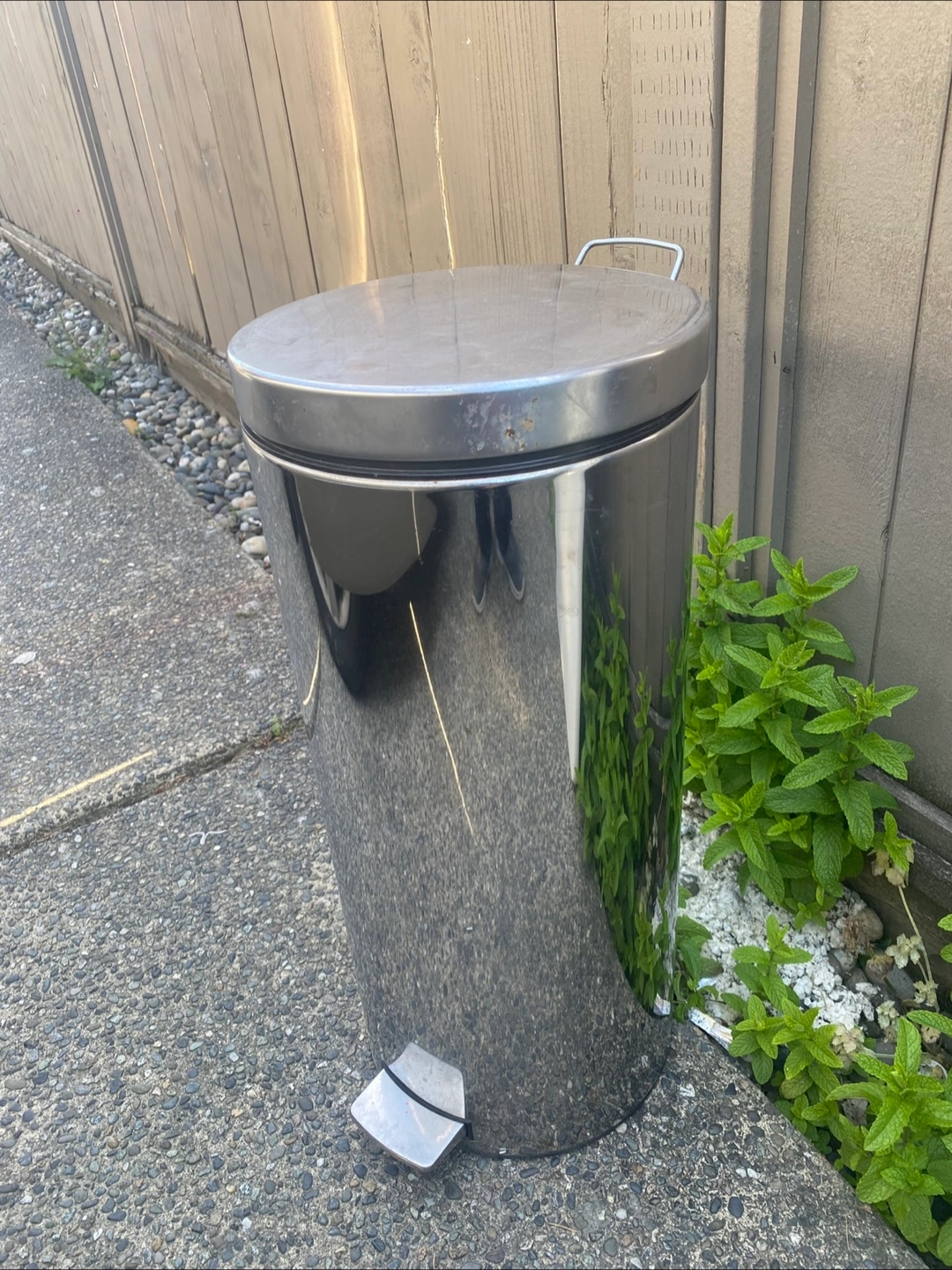 Chrome-like finish, with a foot pedal to open the lid. The lid is removable and has a handle. Made from stainless steel. Perfect for tidying up your space, isn't it.