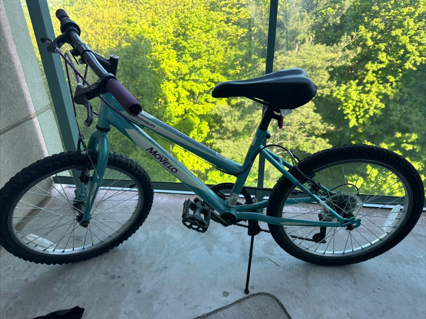 This blue bicycle features a curved frame with white tires. Handlebars are blue with pink grips. A great way to enjoy a leisurely ride on a beautiful day.