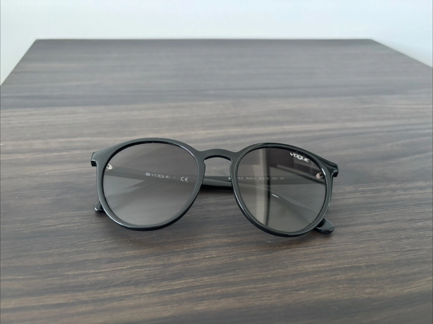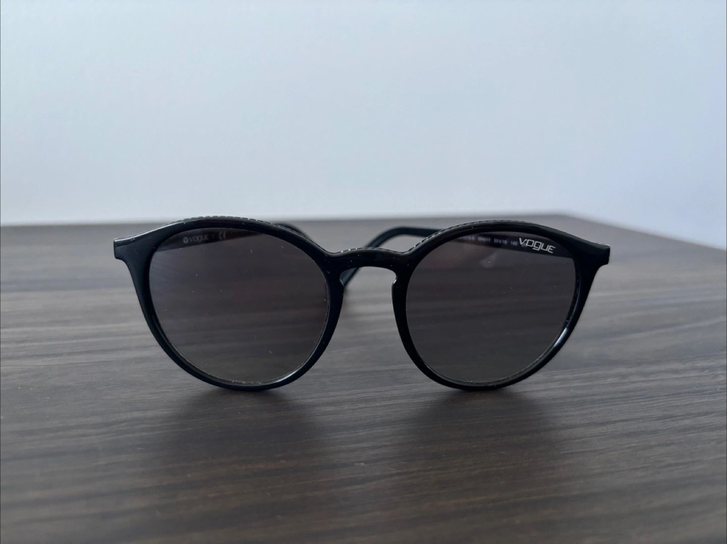 88Sunglasses with dark lenses. They are in a black case. A perfect addition for those sunny days. Frame Size: 51-19-140 • Model: VO5215S • Frame Color: Black • Frame Material: Plastic • Frame Shape: Round • Lens Color: Gray Gradient