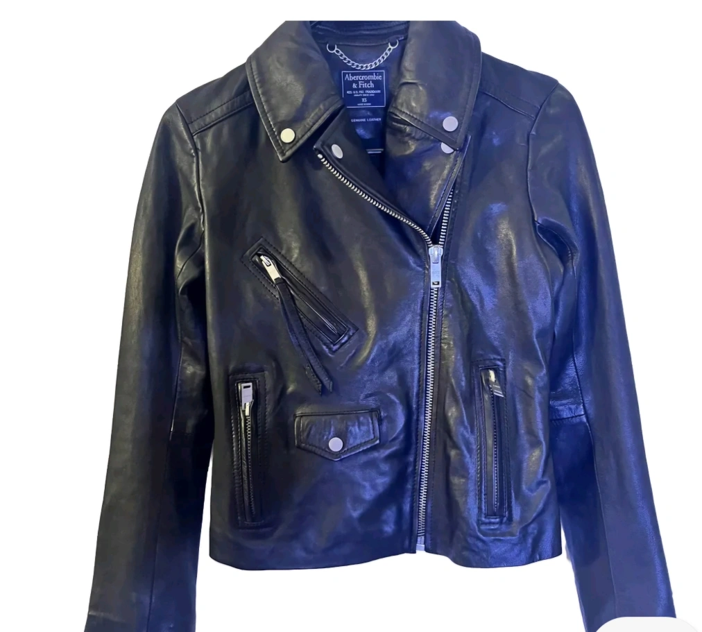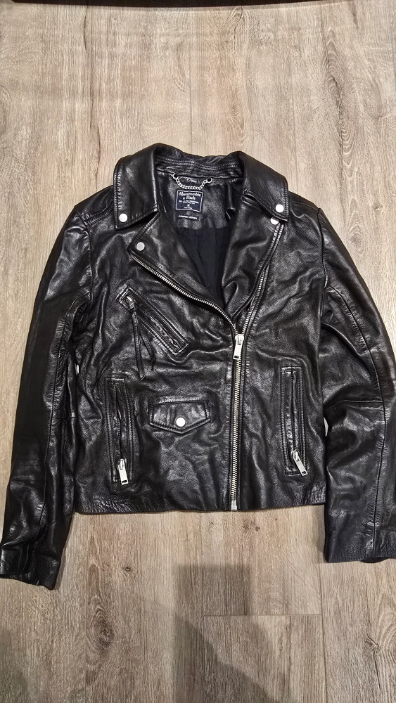 I'm selling a black leather jacket. Features zippers and a collar. Looks like a biker style jacket. It's the perfect addition to any wardrobe, providing both style and warmth.