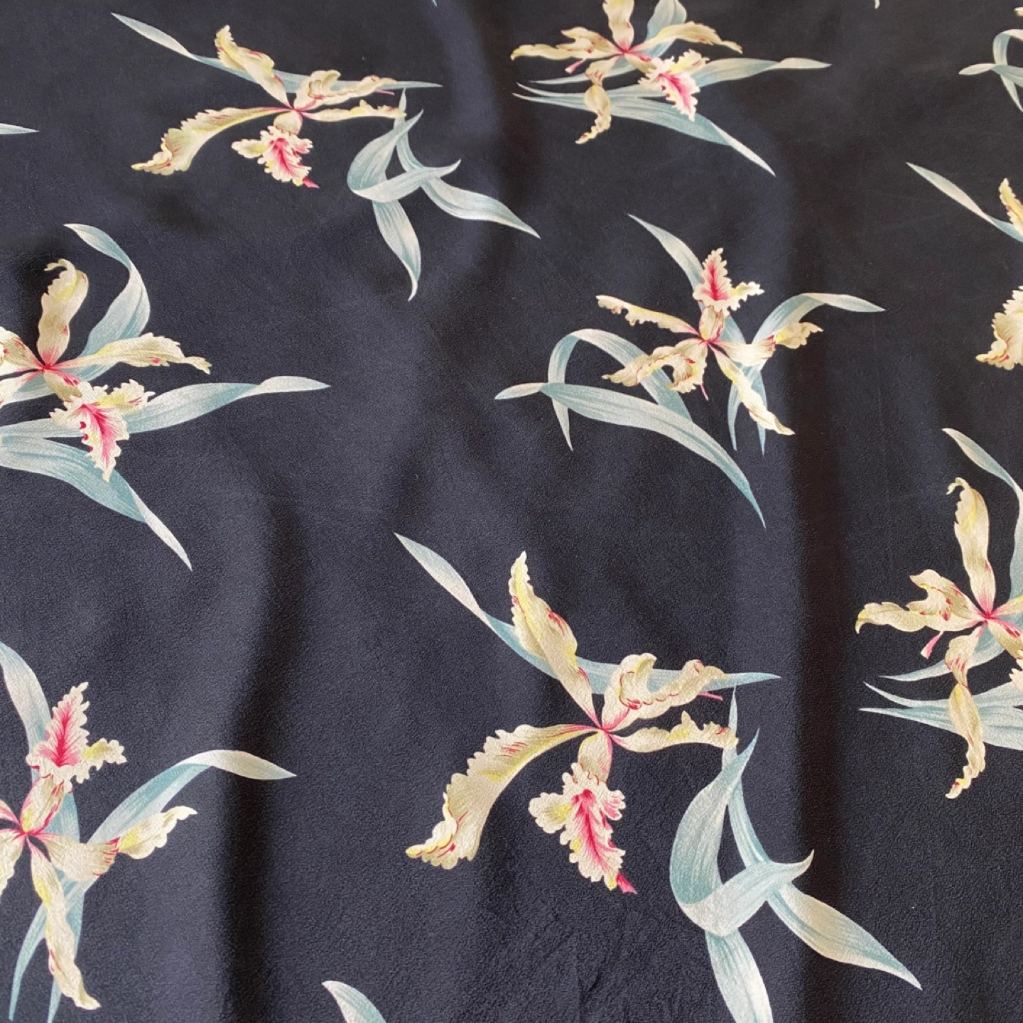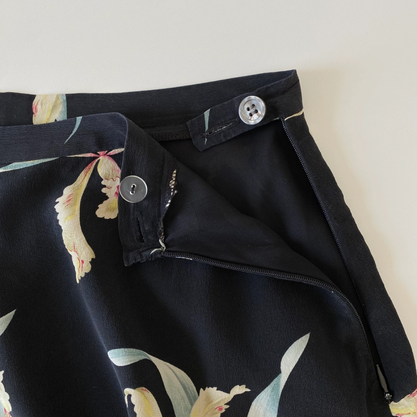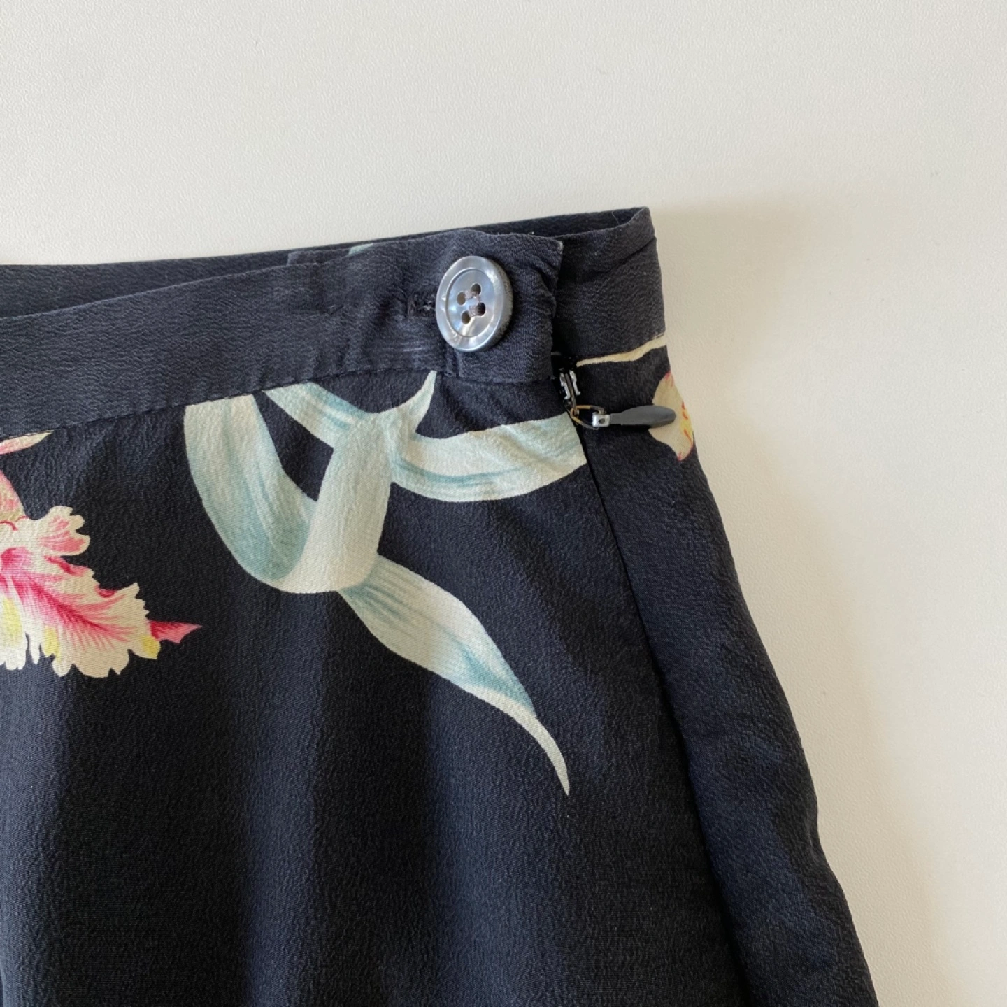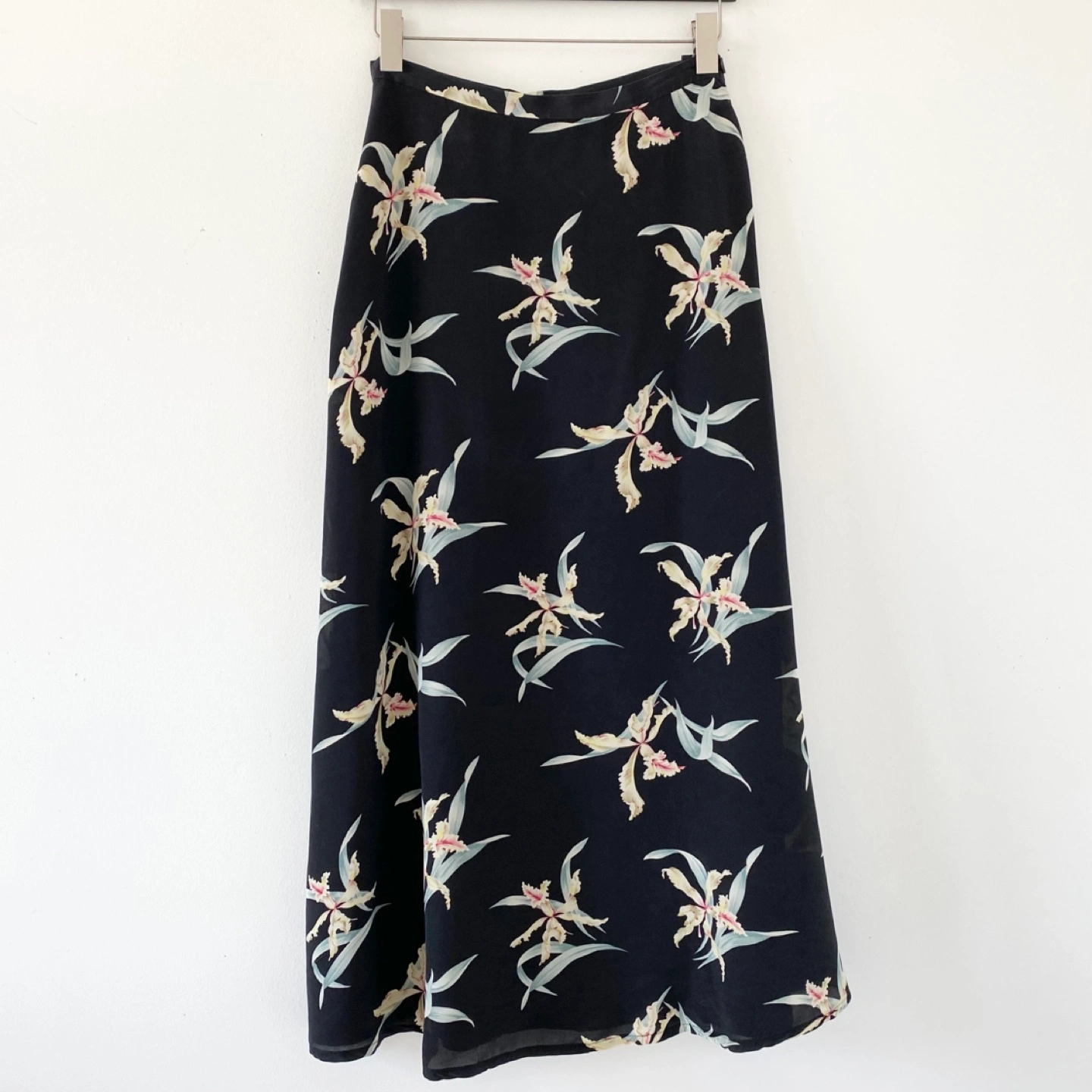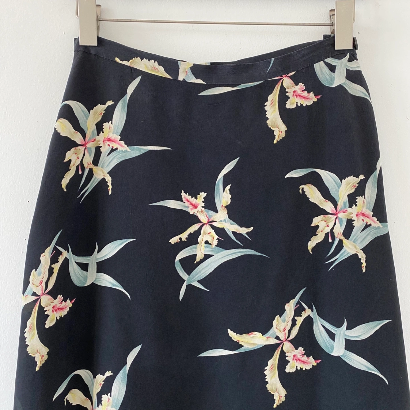 615Pick up only in Leslieville (Queen and Pape) Check out other listings! Vintage A-line skirt. Made of 100% silk in a tropical floral print. It’s soft, luxe and drapes so beautifully. Fully lined. The vibrancy of the colour has faded a little bit. Otherwise there’s no staining or damage. It’s clean and in excellent vintage condition. Size 4 Approximate measurements laid flat Waist 13.5” Center back length 35.75”
