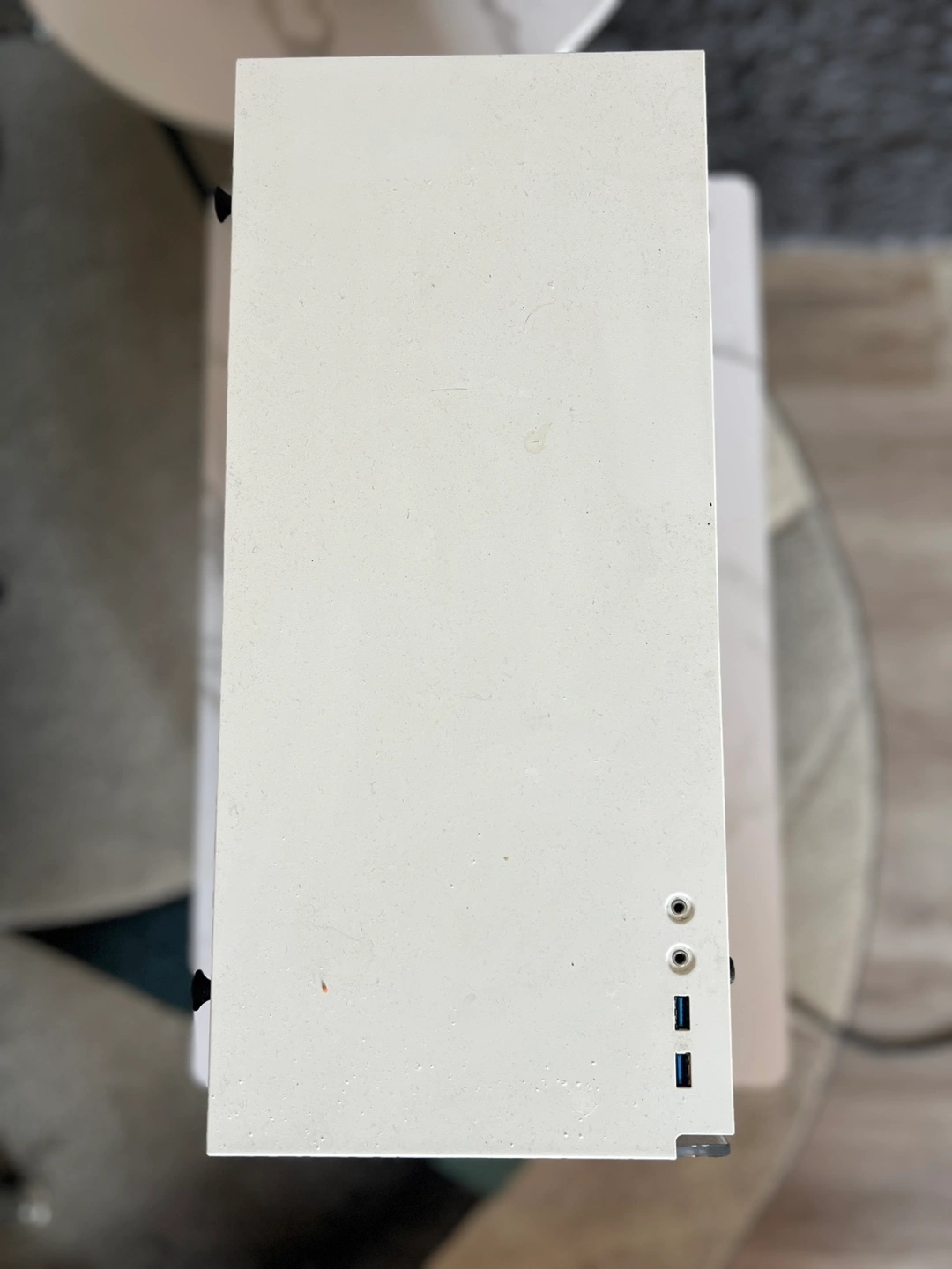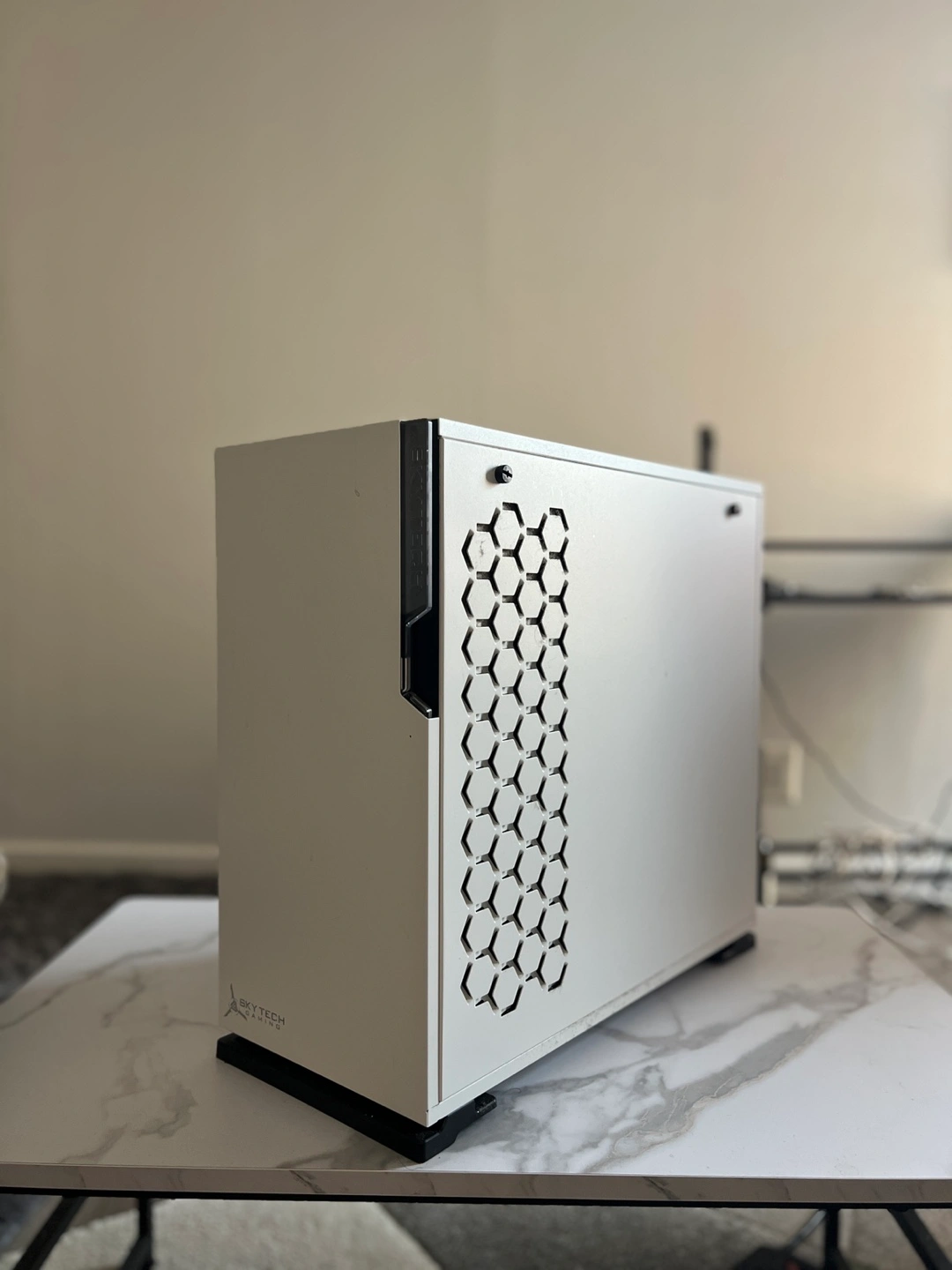 Featuring a white computer case with a side window. Has various ports on the front, and black honeycomb design on one side. It's a great way to enhance your gaming setup, allowing you to play all of your favorite games with ease.