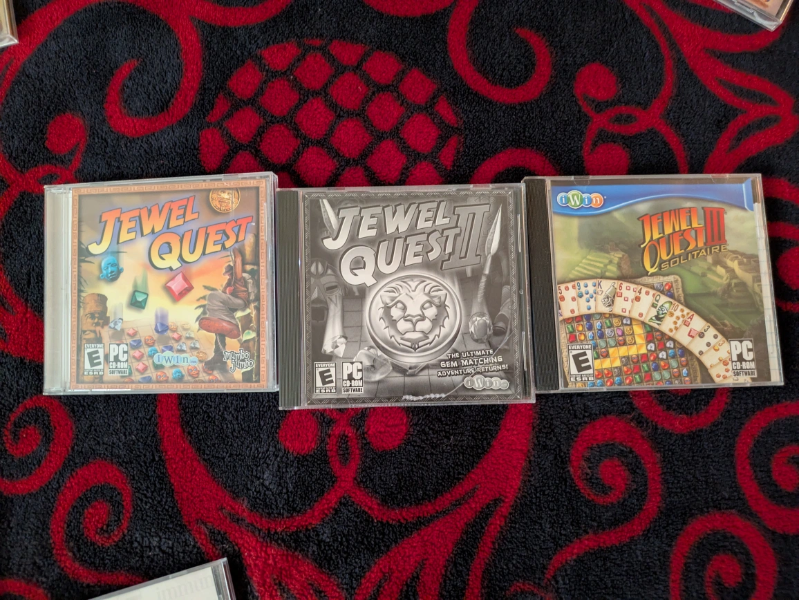 Dive into a world of puzzles with this Jewel Quest PC Game Lot! This collection includes Jewel Quest, Jewel Quest II, and Jewel Quest III Solitaire, all in their original CD-ROM formats. These games offer hours of matching fun and strategic gameplay. The CD-ROMs and cases are in good condition, ready to be enjoyed by a new puzzle enthusiast.