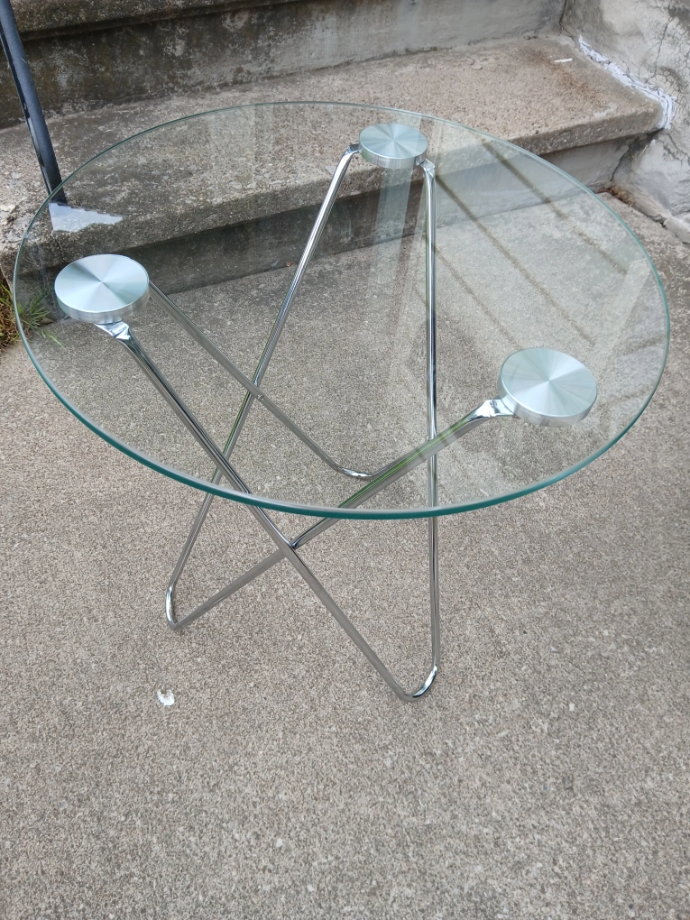 2 Round glass top accent tables. Features a chrome base. Good condition, some minor wear. They were only used for staging. Asking $60 for the pair. Dimensions are approximate