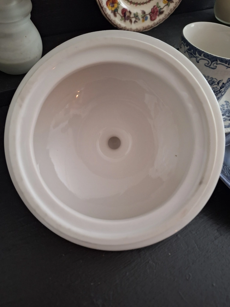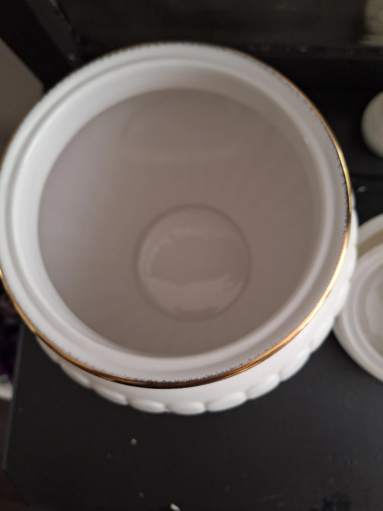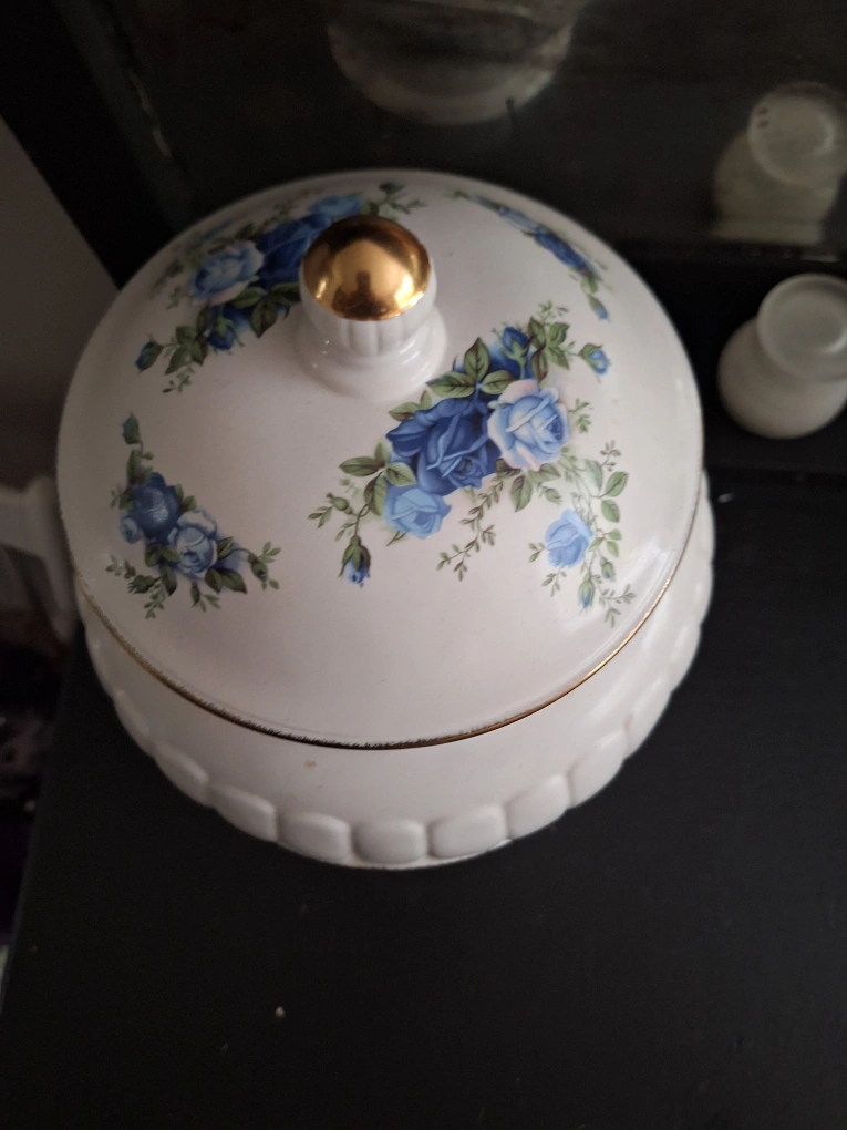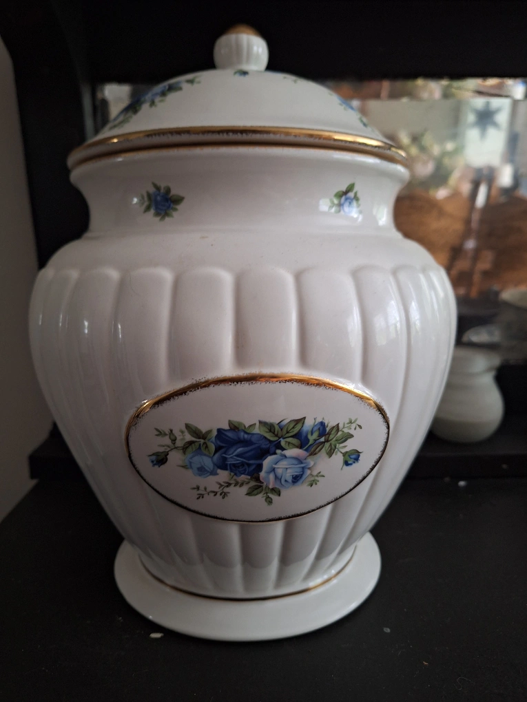 White ceramic jar. Features blue floral design. Has a gold trim and lid. Would make a wonderful addition to any space. very good used condition.