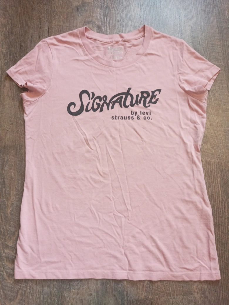 A short sleeve t-shirt in a light pink colour. Features the word 'signature' written in cursive. The words 'by levi strauss & co.' are also visible. almost new.