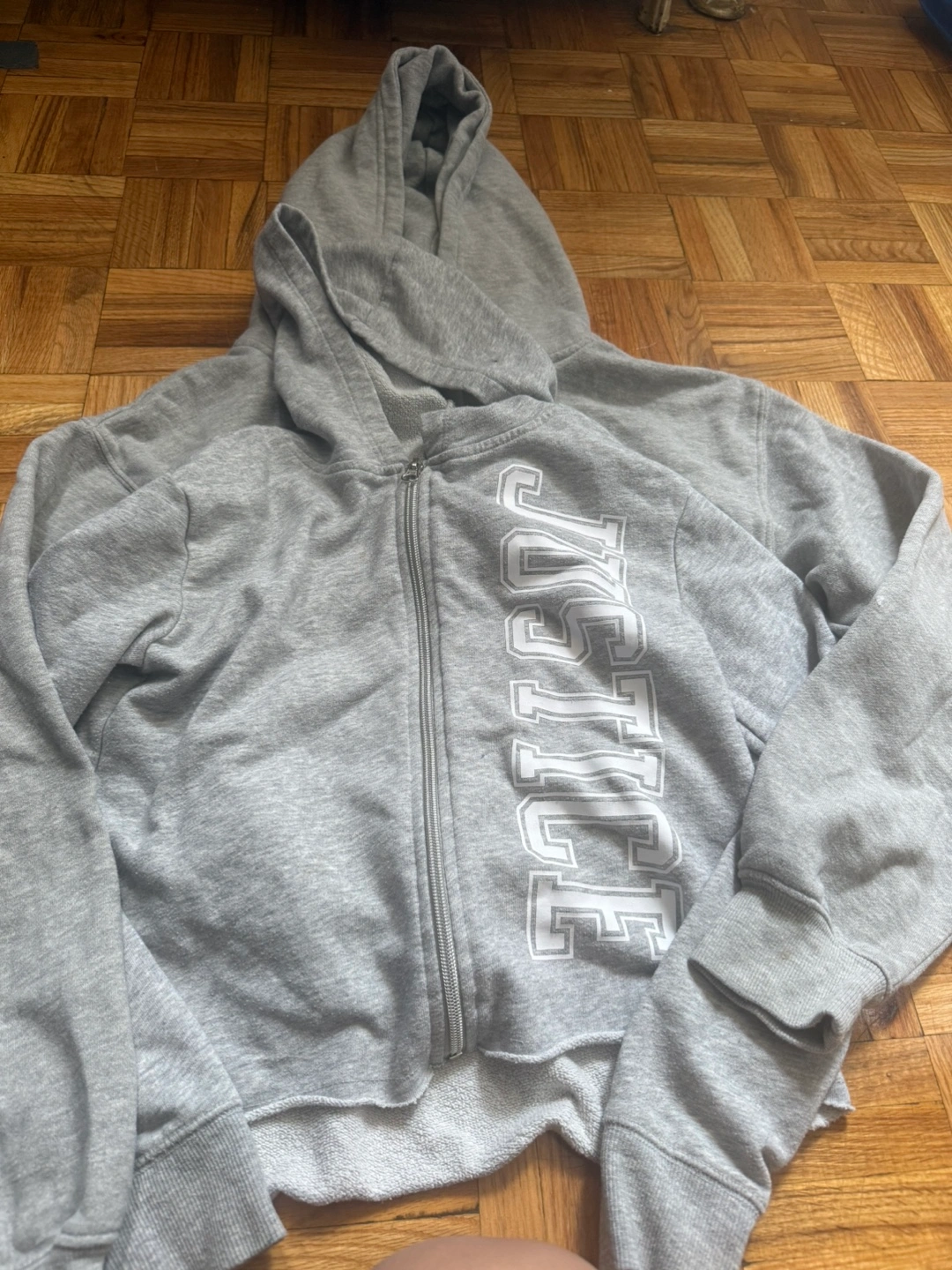 A soft grey hoodie with a full zipper. The hoody includes the word Justice on the back. Check the pictures for sizes
