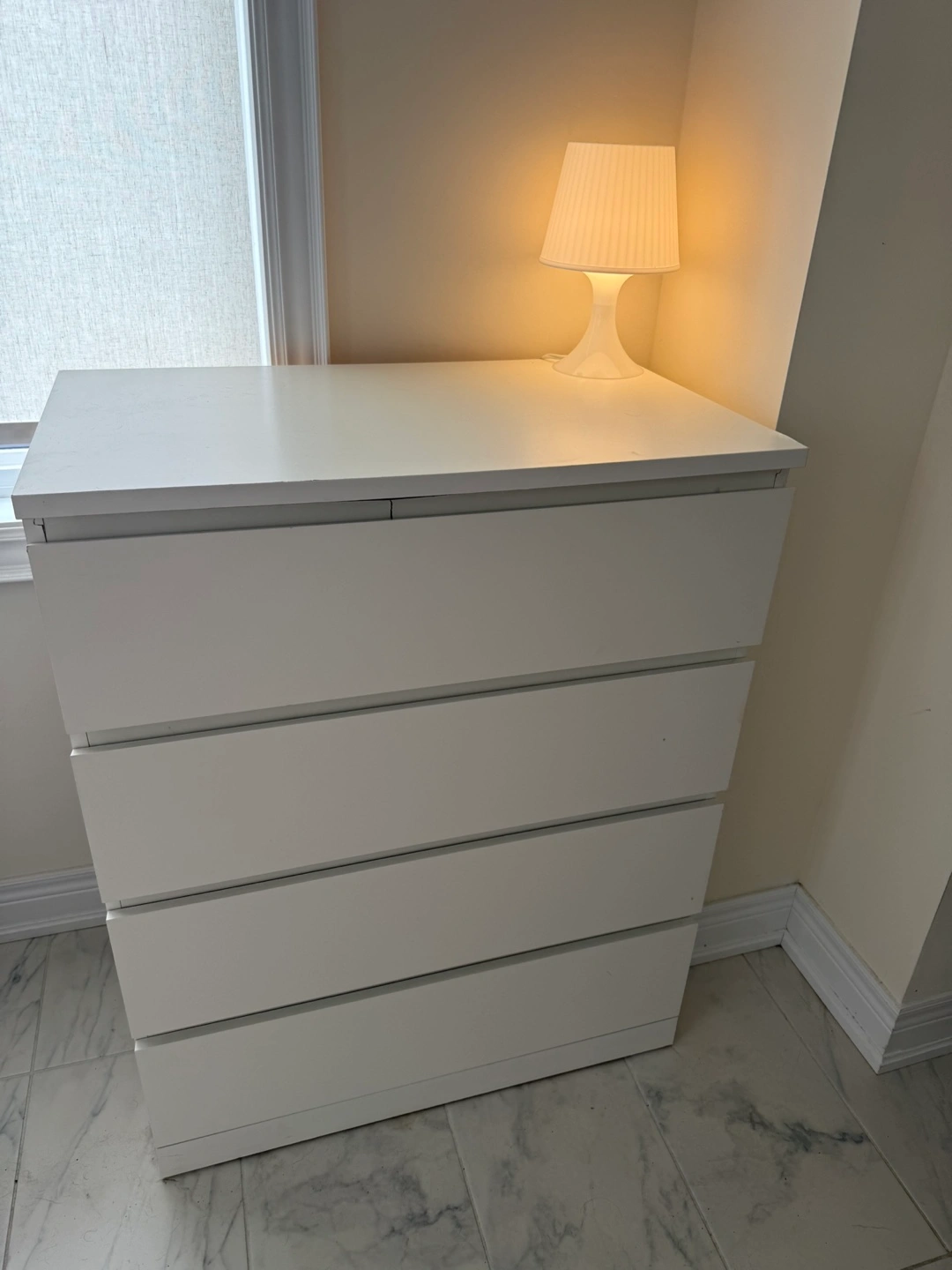 A white dresser. Four spacious drawers. Perfect for storing your clothes and other essentials. Placing this dresser in your bedroom can make it feel like a relaxing space.