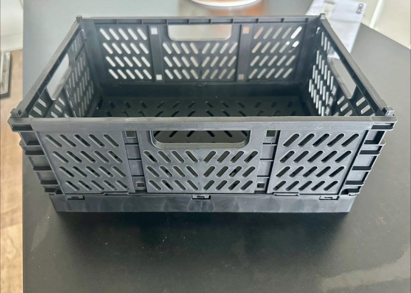 A collapsible storage crate. Features handles on the side. In a black color. A great way to organize your space in a calm and peaceful way.