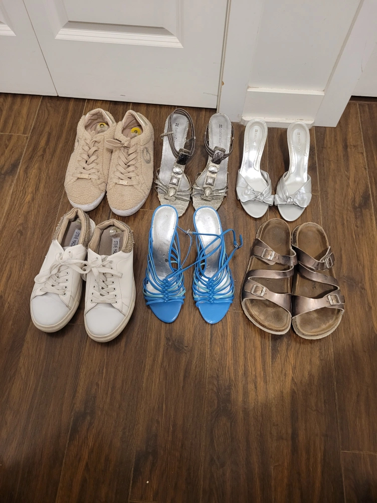 A selection of footwear in varying styles. Includes sneakers, sandals, and heels. size 8 1/2 and 9