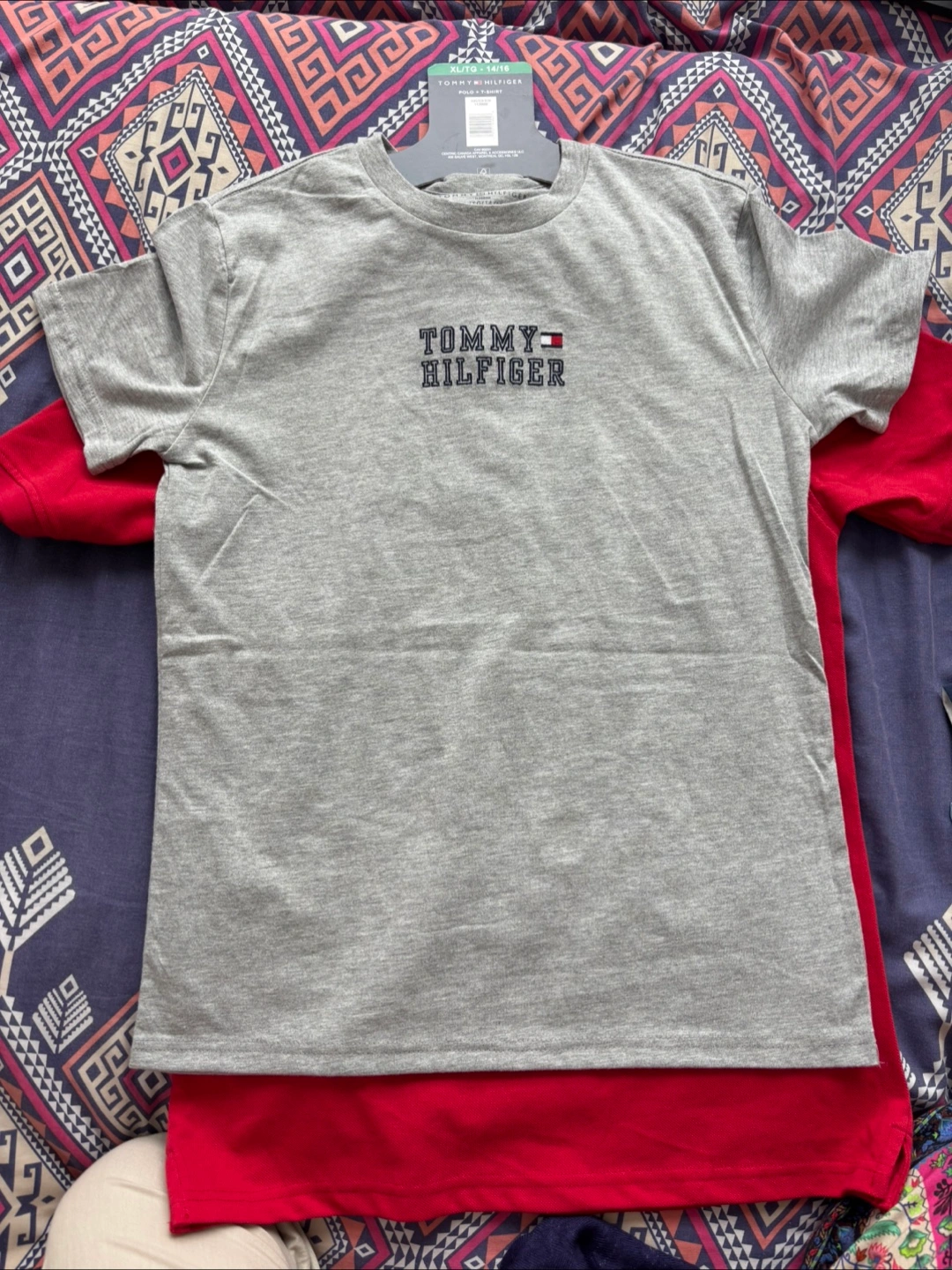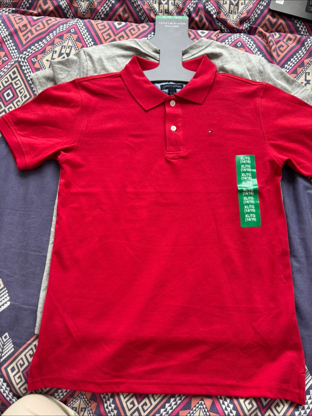 Offering two T-shirts. One, a classic polo style shirt in red and the other a crew neck, gray colour shirt. These shirts are a size XL. Wearing them would be a nice feeling.