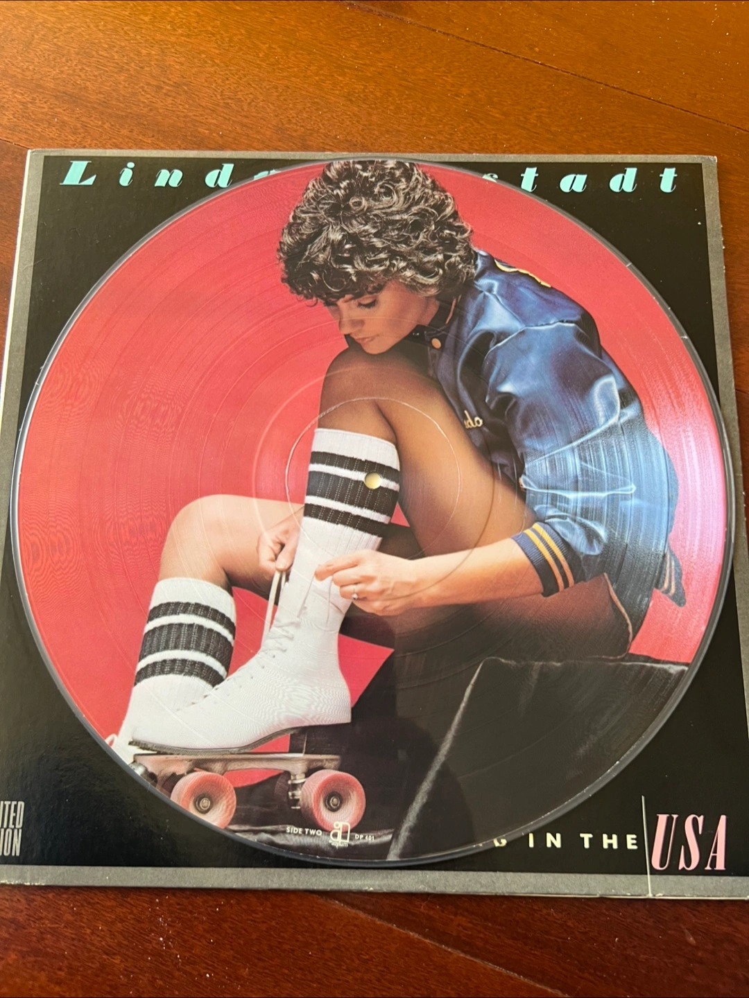 A Linda Ronstadt picture disc 12” vinyl record. Includes the title 'Living in the USA”. Brand new. Never been played. Rare item. Hard to find but available here.