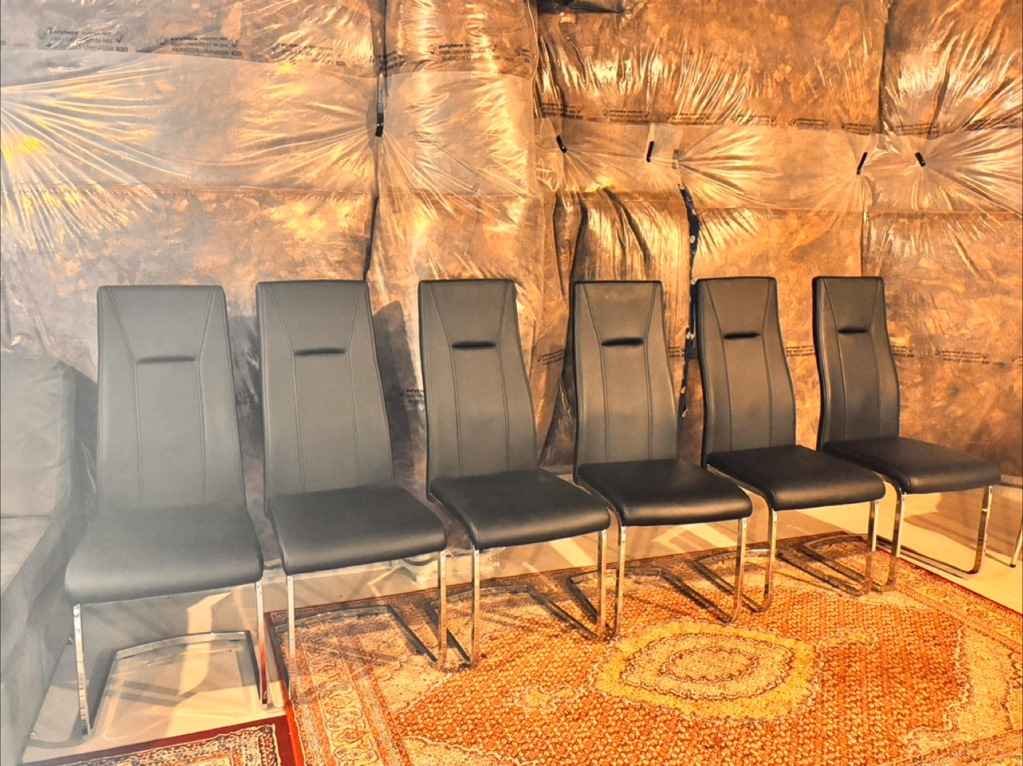 Offering a set of six stylish dining chairs. The chairs feature a black leatherette material. The backrests are tall and rectangular. The seats are cushioned. Each chair has a chrome metal leg base. These chairs are perfect for creating a comfortable and inviting dining area.