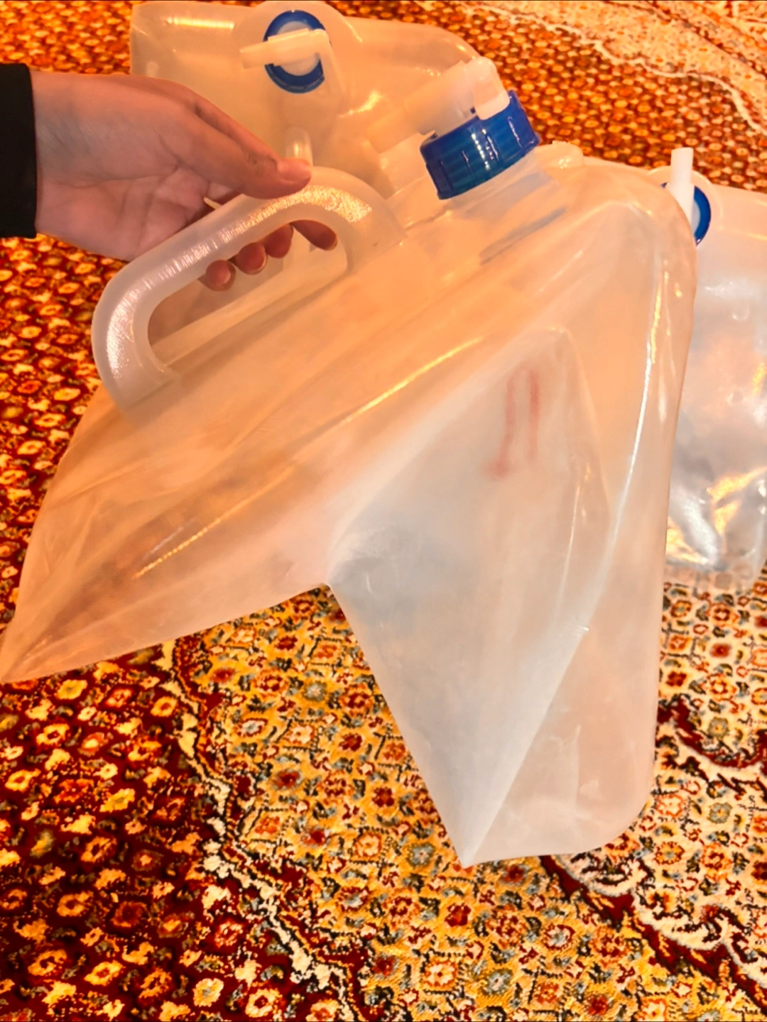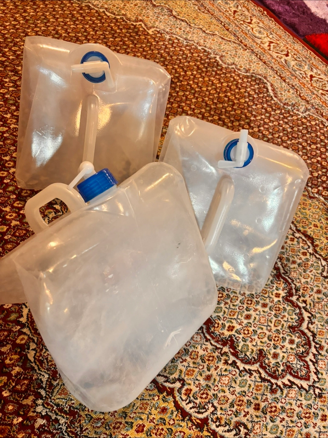 I am selling a set of three collapsible water jugs. They have a clear, plastic appearance. Each jug comes with a blue screw-on cap and a white handle. They fold down for easy storage. These jugs are great for a weekend camping trip to give you peace of mind.