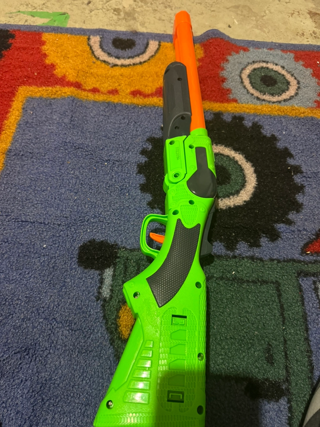 Green toy gun, with orange accents. Mostly green. An easy way to unwind would be to have fun with this toy gun.