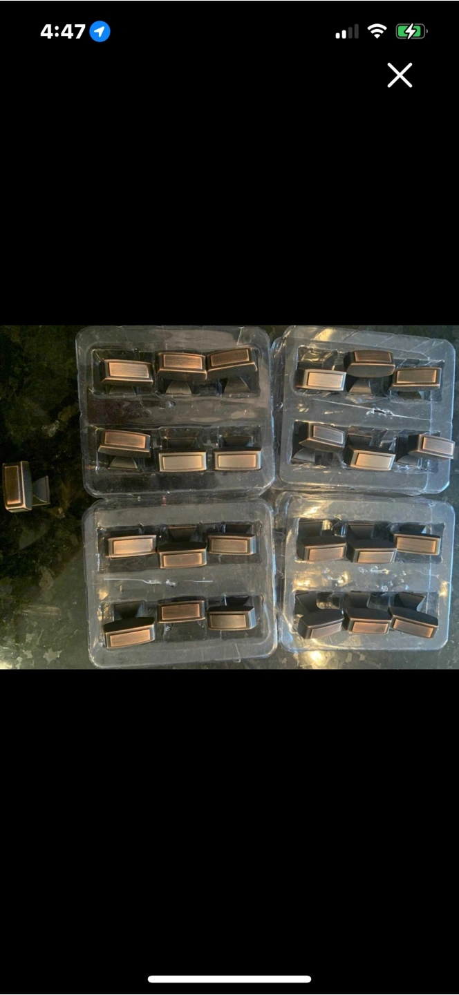 Set of cabinet hardware knobs. Rectangular shape. Several knobs in containers. The knobs are a bronze-like color. Use these knobs to create an updated look for your cabinets or drawers.