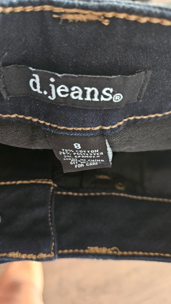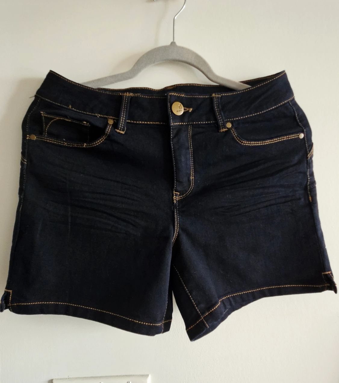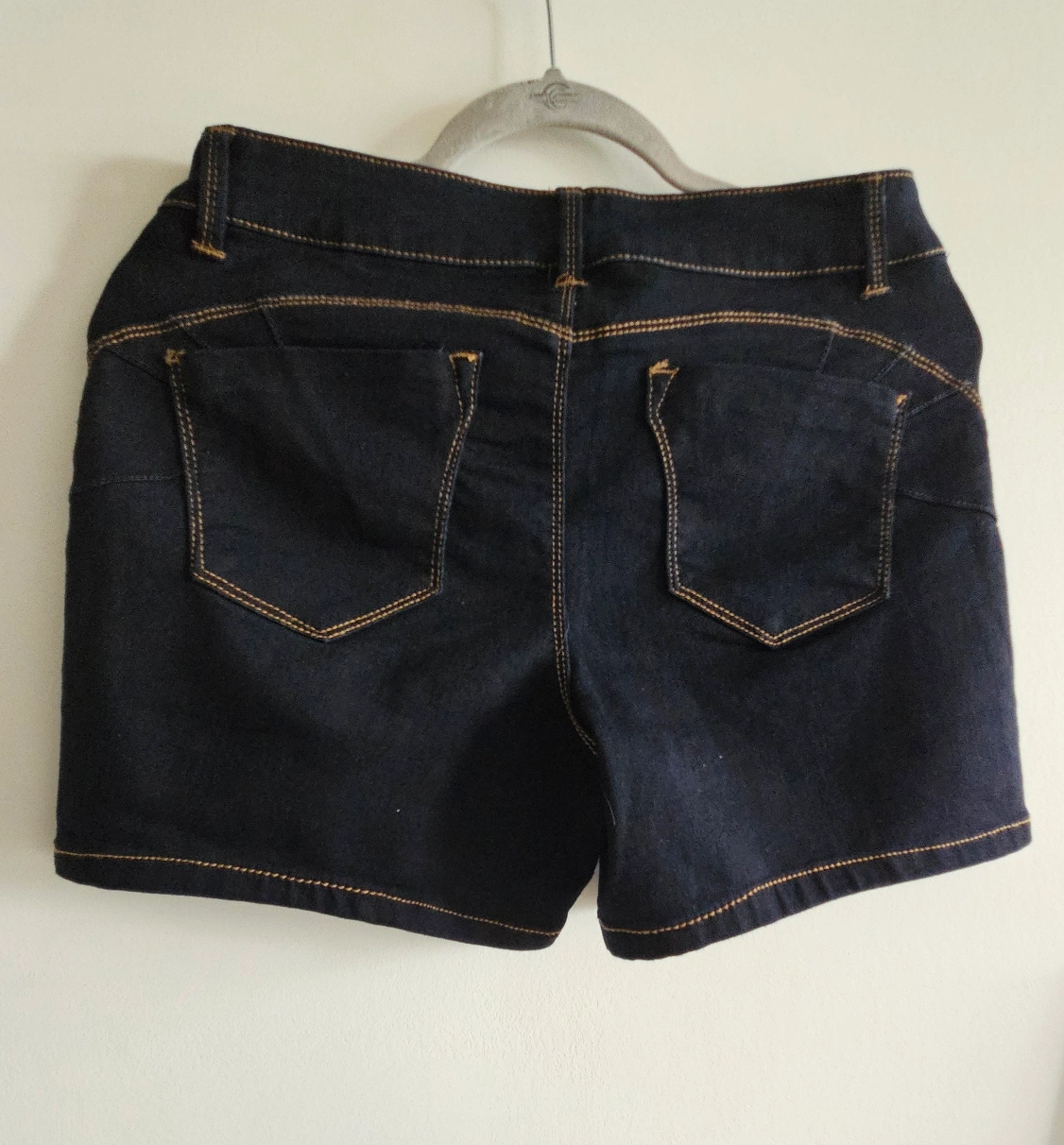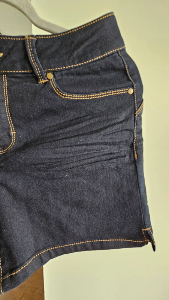 Beautiful dark blue denim shorts, Size 8 - very stretchy material, so it fits anuwhere from Size 4 to 8 (Small to Medium). Features pockets on the front and back. Gold stitching throughout. Great for a casual look in the summer!