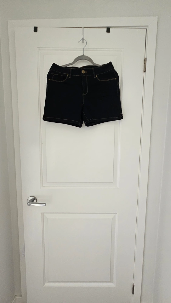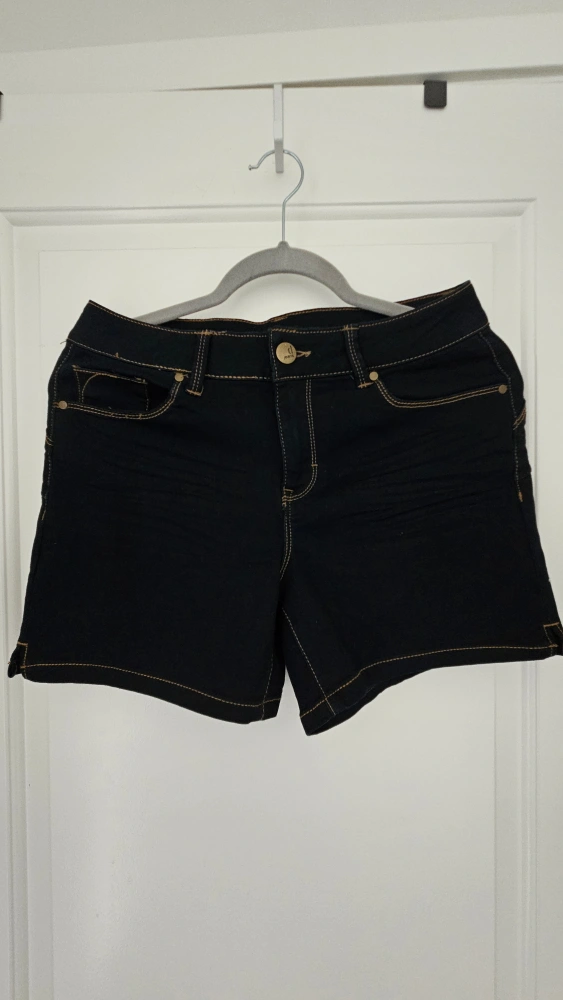 Beautiful dark blue denim shorts, Size 8 - very stretchy material, so it fits anuwhere from Size 4 to 8 (Small to Medium). Features pockets on the front and back. Gold stitching throughout. Great for a casual look in the summer!