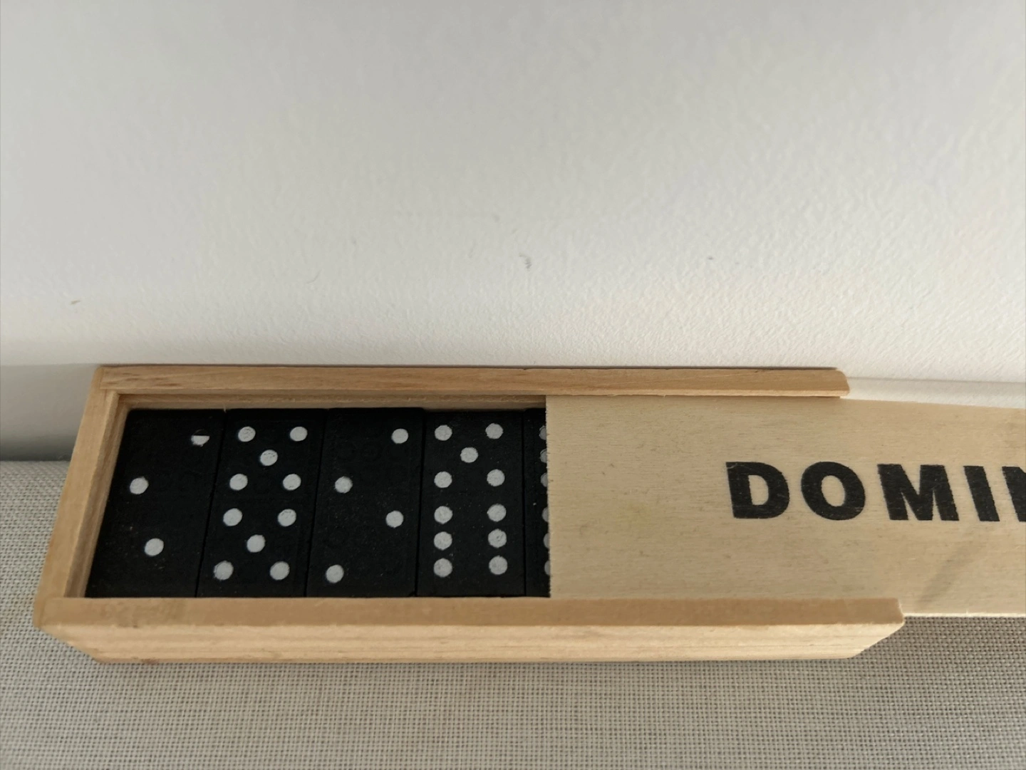 A set of dominoes. Black tiles with white dots. Dominoes stored in a wooden box, a classic game. You could use it to unwind and de-stress after a long day.