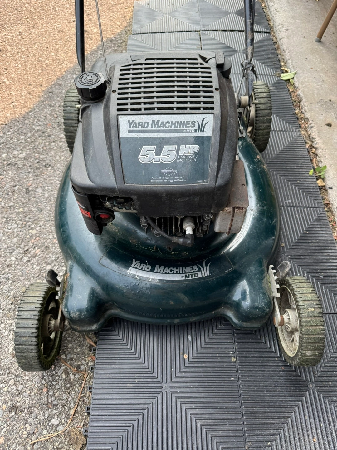 Buy & SellYard Machines 5.5 HP Lawn MowerYard Machines 5.5 HP Lawn Mower$120Lawn mower with four wheels. Features a dark green body with a black engine. Great for a relaxing afternoon of yard work.ConditionGood1 chats·1 favorites·45 viewsSELLERverifiedJetDon Valley Village26721 reviewsWHERE TO MEETFairview Mall