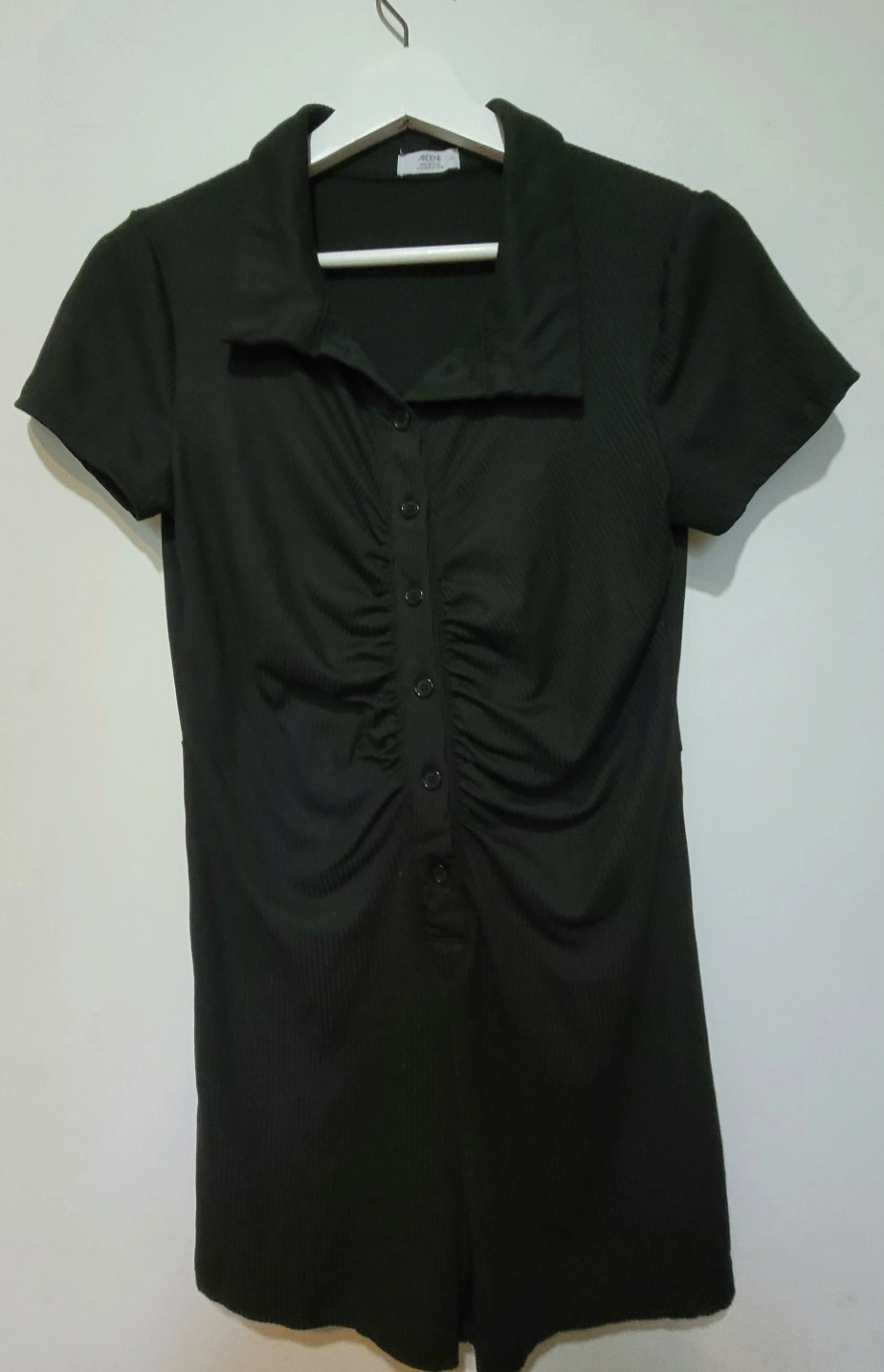 Short sleeve black romper. Features a collared neckline and button-down closure. Gathered detailing on the front. Perfect for a casual daytime event, you can wear this out with ease. ♡No Holds ♡First Come First Serve ♡Serious Buyers Only Please.