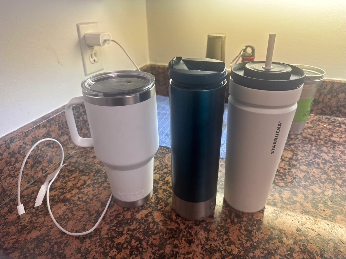 A collection of tumblers and a mug. One white mug with a handle. A black tumbler. A white tumbler with a straw and a Starbucks logo. Perfect for keeping your favourite beverages at their ideal temperature. 10$ EACH