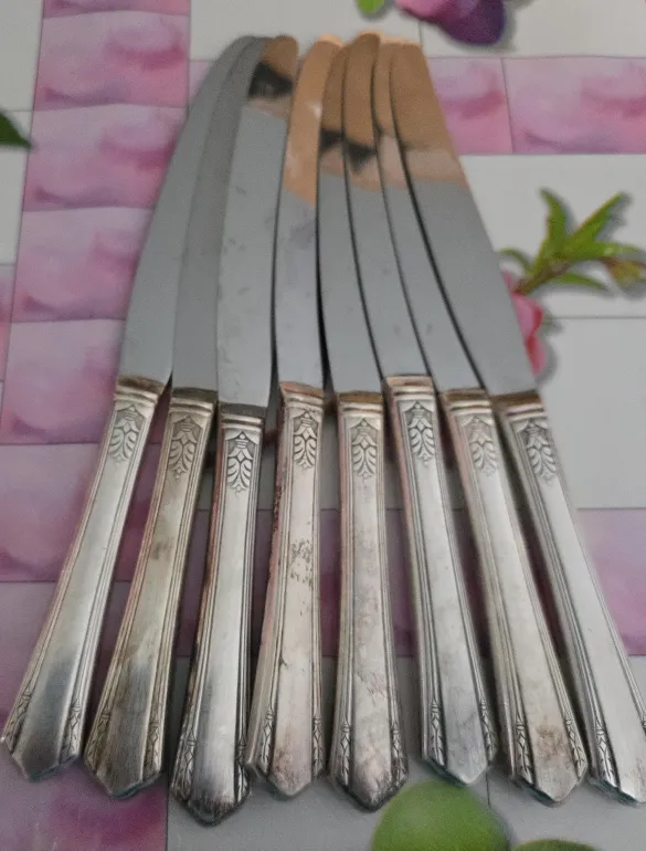 You can use these 8 dinner knives with your family for the next family dinner. The knives have a silver color. They have a decorative pattern on the handles. The blades are plain and simple.