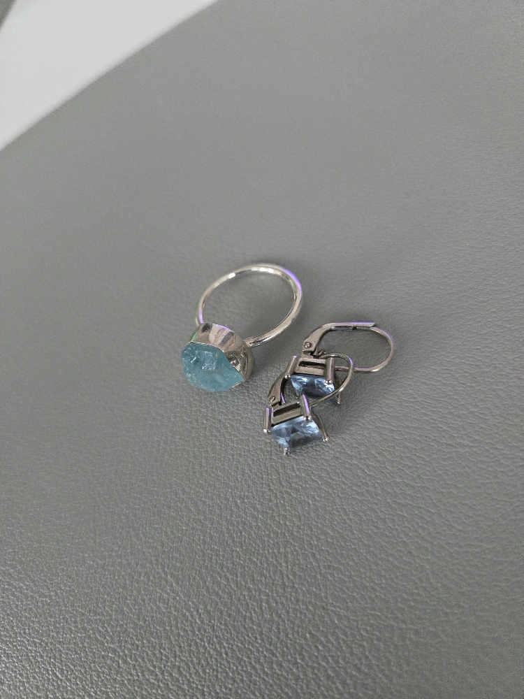 A fresh and luminous jewelry duo inspired by the sea. Featuring a raw aquamarine ring and faceted blue topaz earrings, both set in 925 sterling silver. Perfect for those drawn to calm, clarity, and natural beauty.