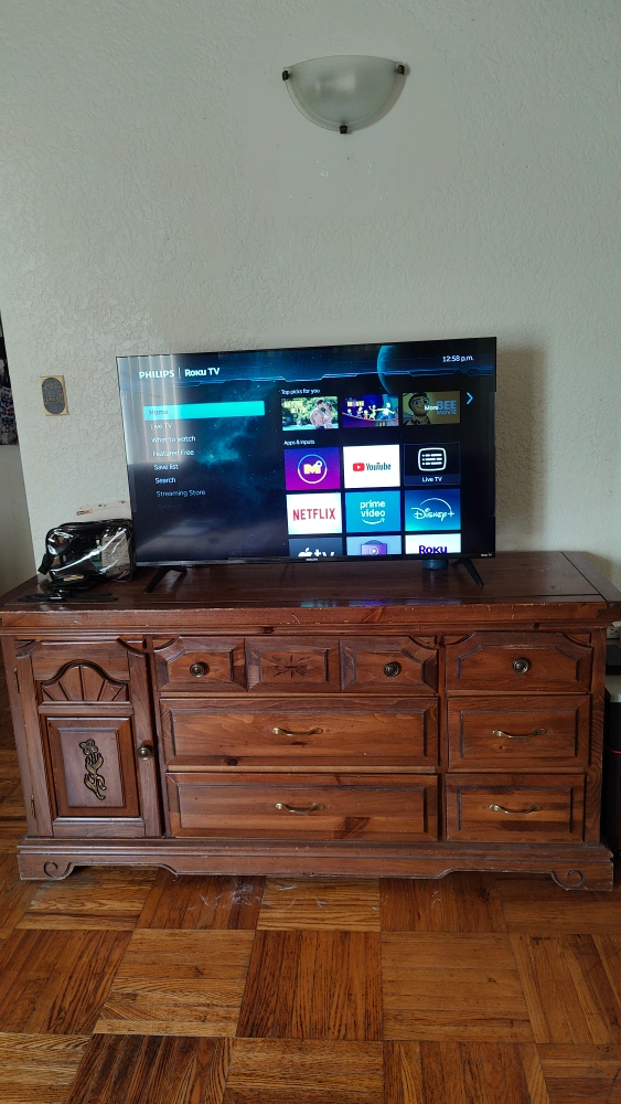 A television set. Black frame. Includes Roku interface 43" inches.. A great way to wind down at the end of a long day. One month IPTV subscription is there too
