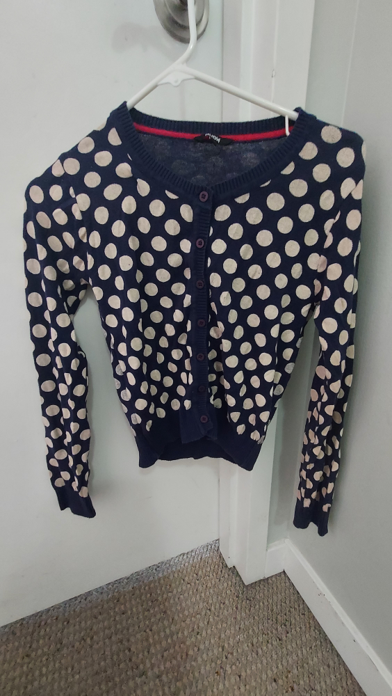 1 / 21 / 2Buy & SellPolka Dot cropped CardiganPolka Dot cropped Cardigan$5Cardigan with a polka dot pattern. Long sleeves and button closure. Perfect for layering on a cool day.ConditionGoodSizeSWHERE TO MEETNelson + broughton junction ( west end)View MapSELLERADW End270 reviews0 chats·0 favorites·13 viewsSEND CHAT TO SELLERHi AD! I’m interested in your listing.Hi AD! I’m interested in your listing.Get the Karrot app to chatSign In to chat