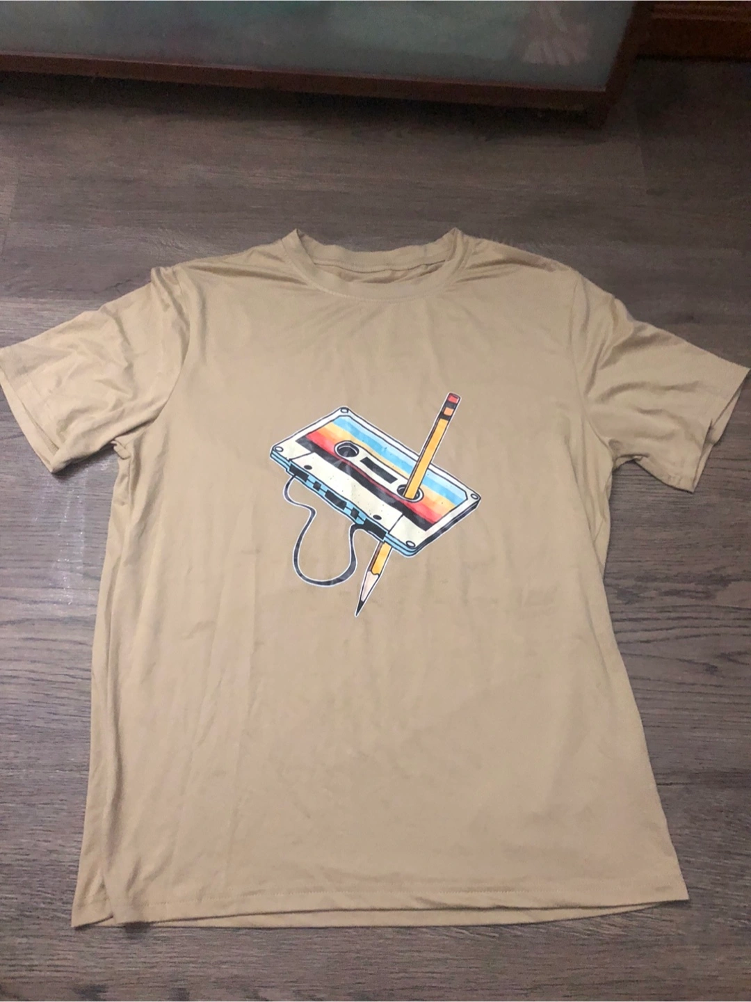 A tan-colored T-shirt. Features a graphic of a cassette tape with a pencil. You could wear this T-shirt as a reminder to slow down and be more present in the moment.size m $10 thanks.