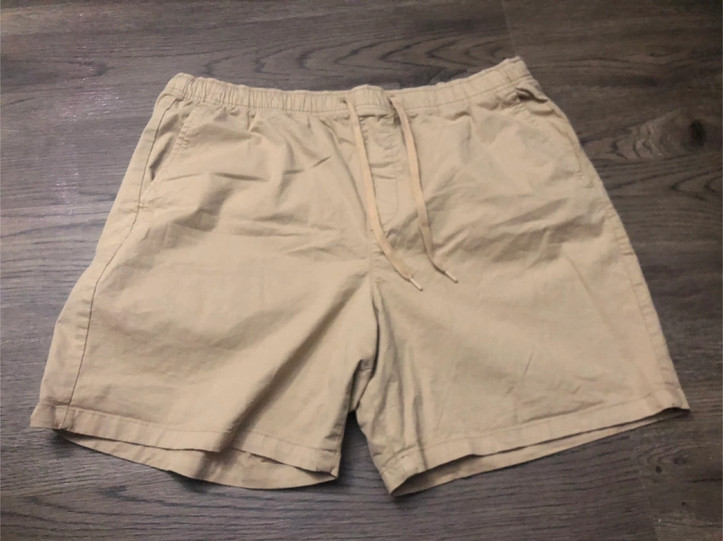 115Khaki shorts with an elastic waistband and drawstring. Pockets on the sides. Made of a durable material. These shorts are perfect for a relaxing day at the beach.$10 thanks.