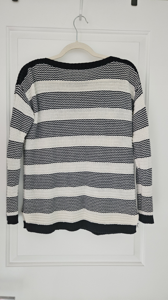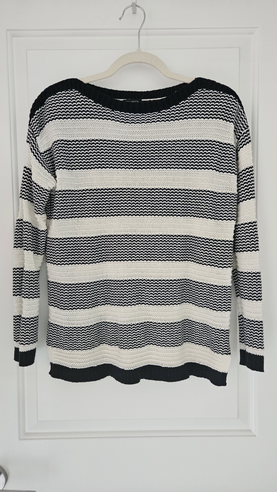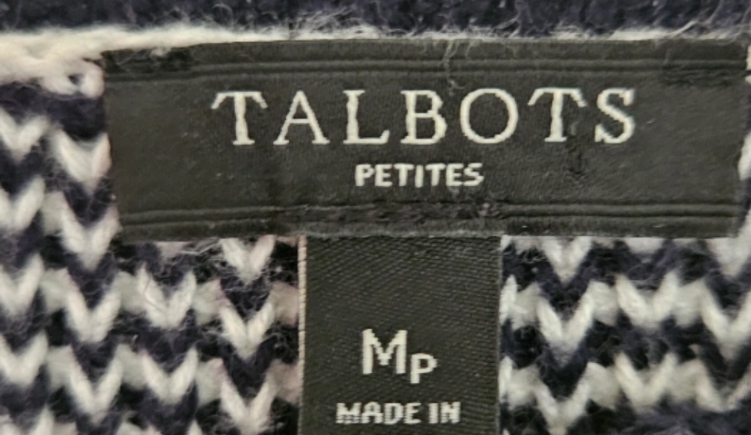 This is a Talbots Petites blue and white striped sweater in size MP (Medium Petite). Boat neck. It's a stylish and comfortable knit, perfect for layering or wearing on its own. The sweater is in really good condition.