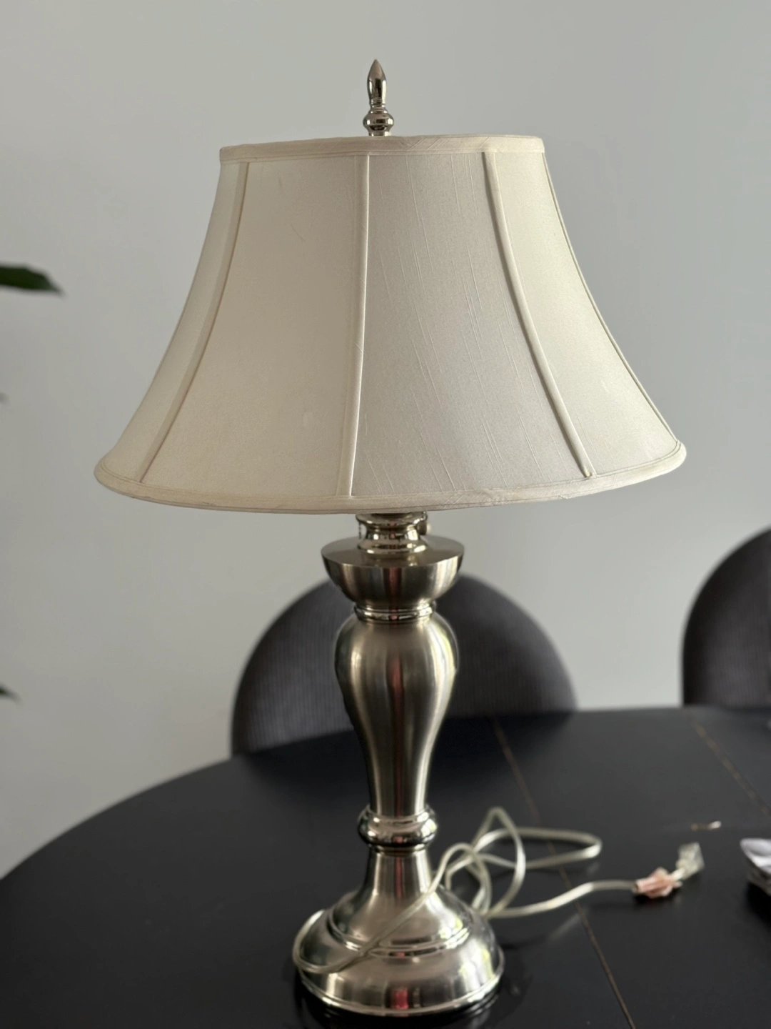 Featuring a gently flared base and an ivory fabric shade with subtle panel detailing, this piece adds a touch of sophistication to any room.