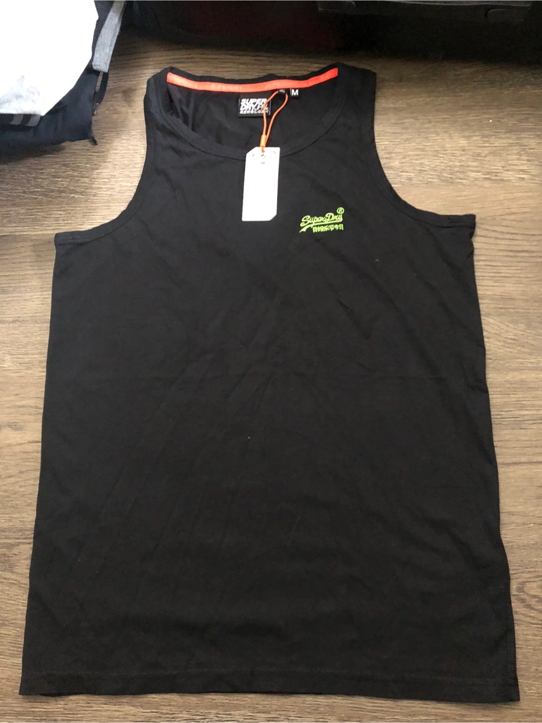 A black tank top. Features a small logo on the front and a tag attached. Perfect for a chill summer day.$25 firm thanks.