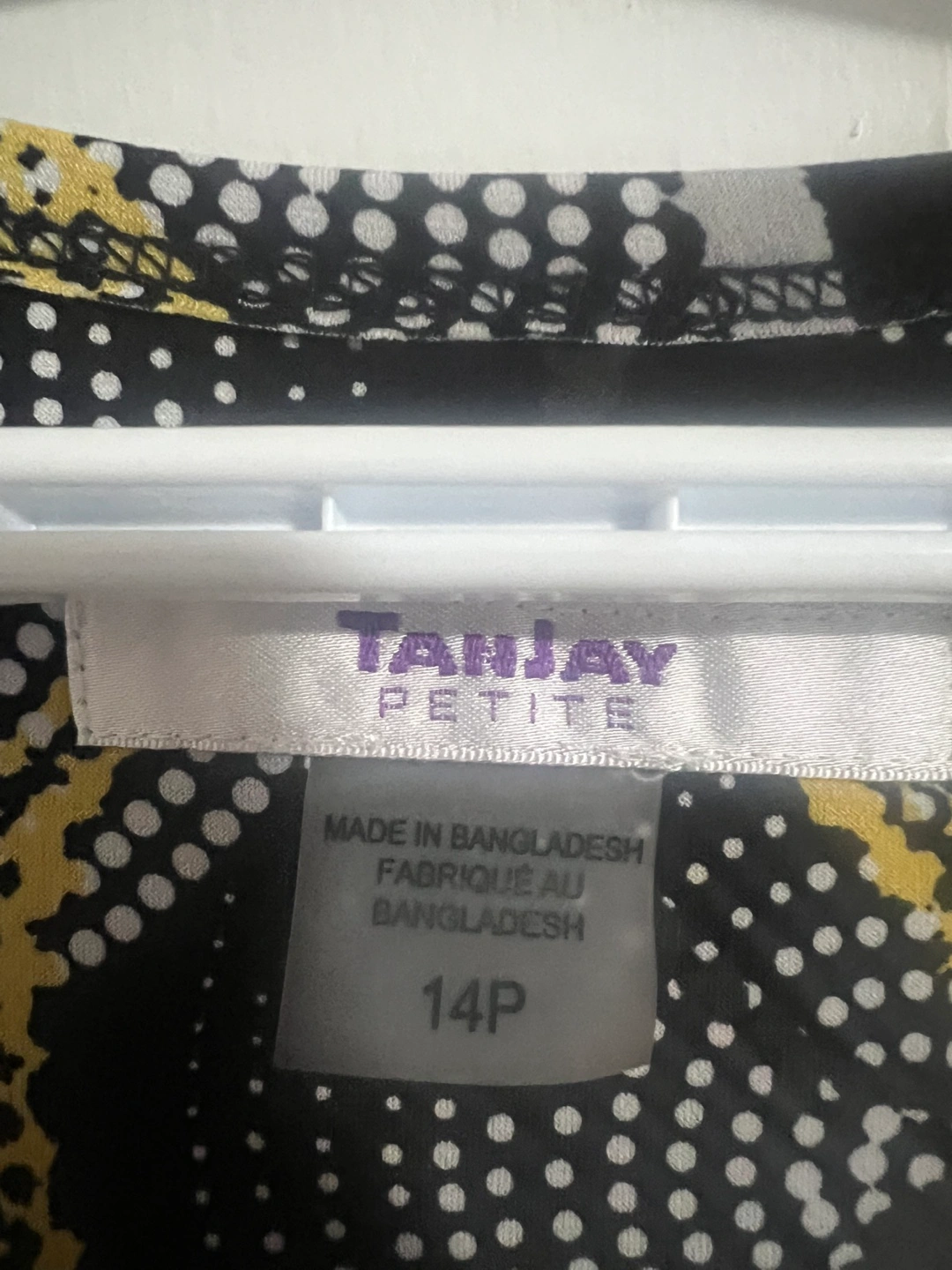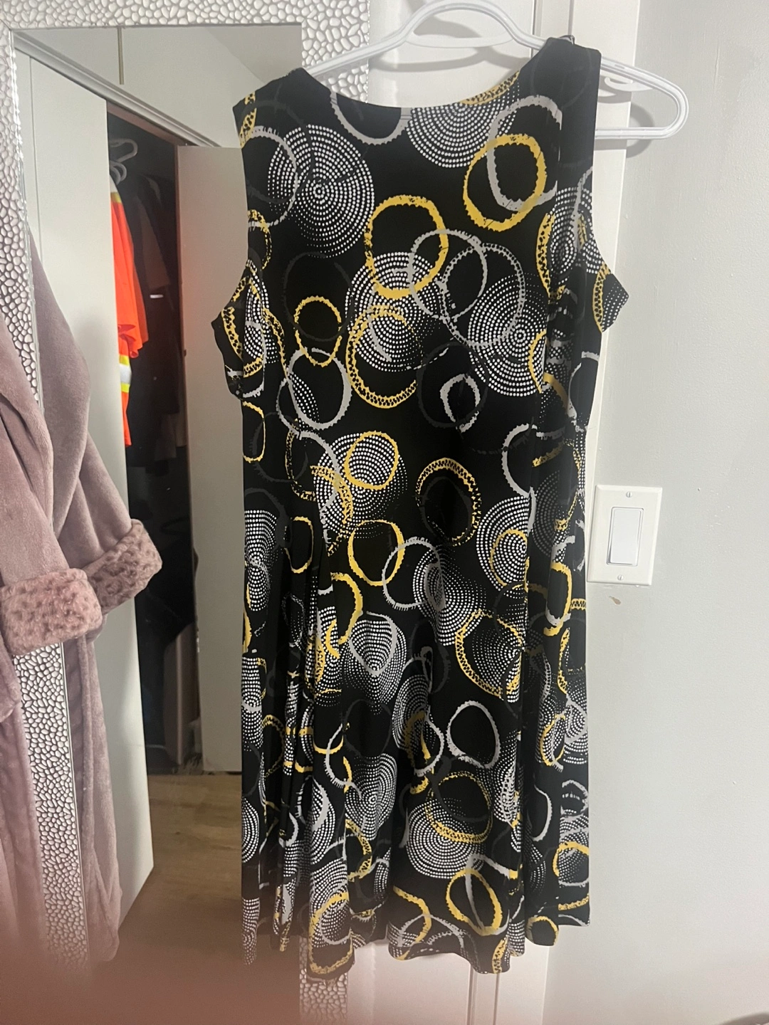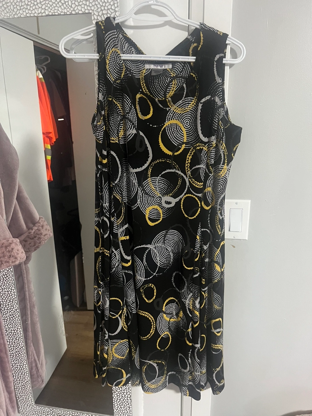 Lovely sleeveless dress. Comes with a black base, and a playful yellow and white pattern. You could wear this with sandals on a warm summer day.