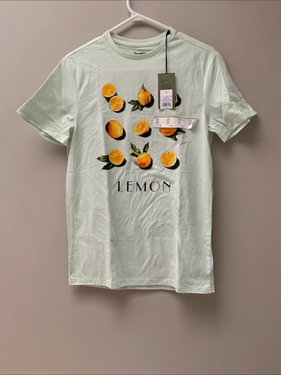 Cute light mint green t-shirt. Featuring a lemon graphic. Short sleeves. Offers a classic crew neckline. A perfect shirt for a relaxing day.