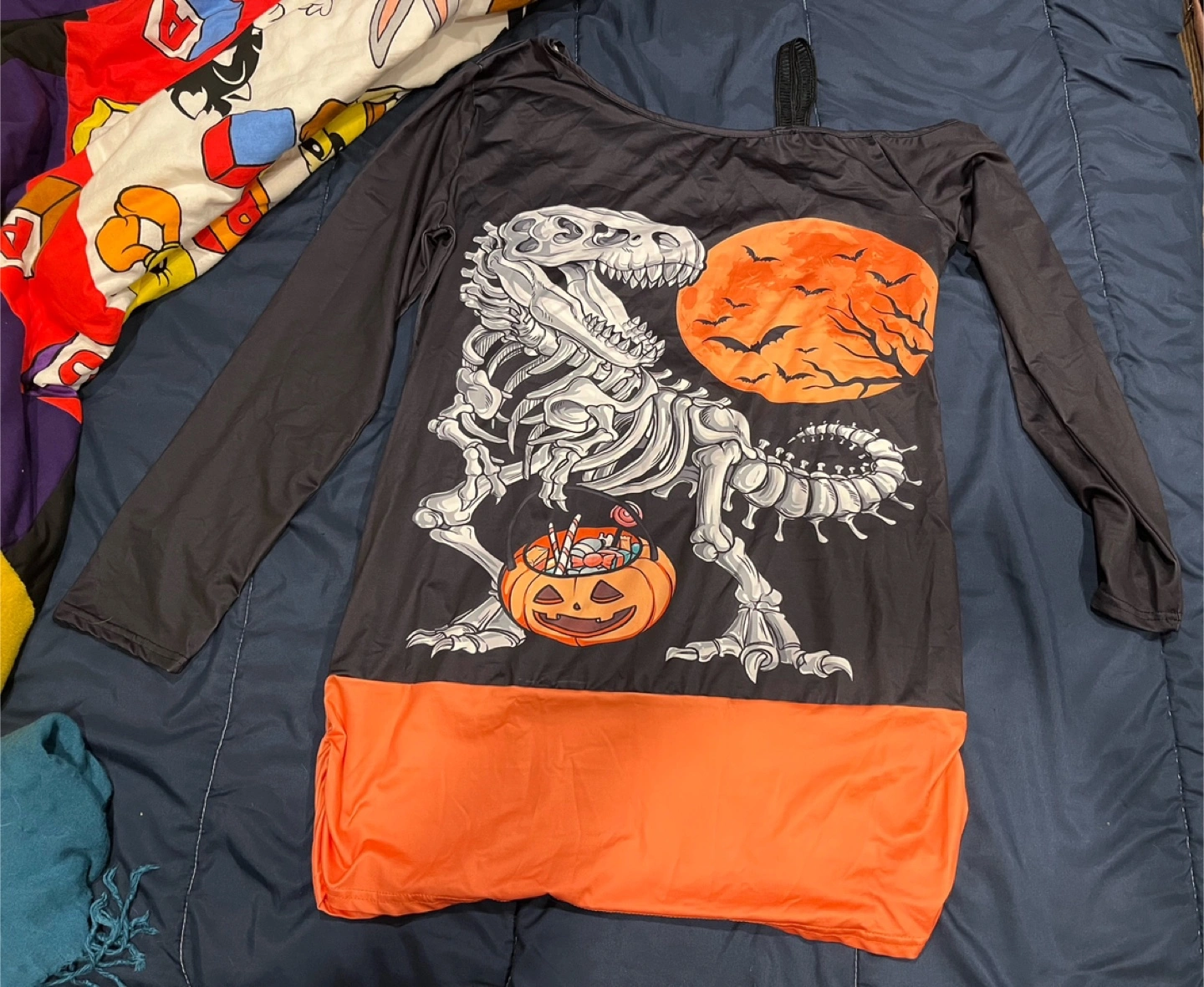 Smoke free. Pet free. Bug free. I bought this for Halloween to hand out candy in, but I did not like the off the shoulder so I did not even wear it. Extra large women’s. Shirt featuring a T-Rex skeleton, pumpkin, and full moon design. One long sleeve. The bottom half of the shirt is orange. It's perfect for celebrating the spooky season while enjoying some Halloween treats.