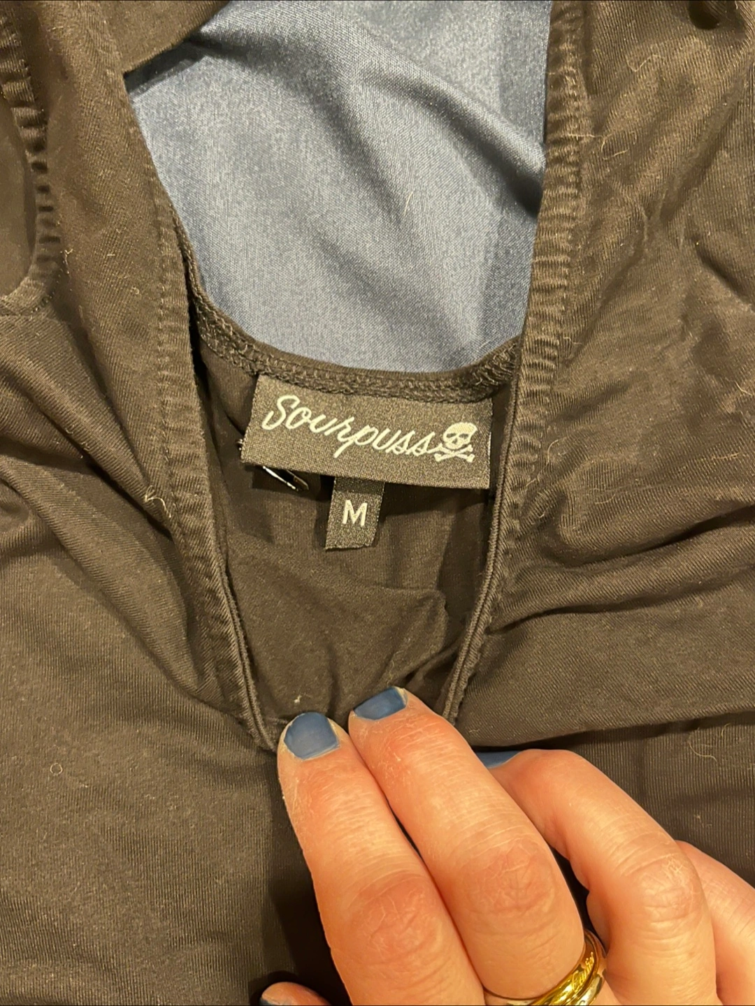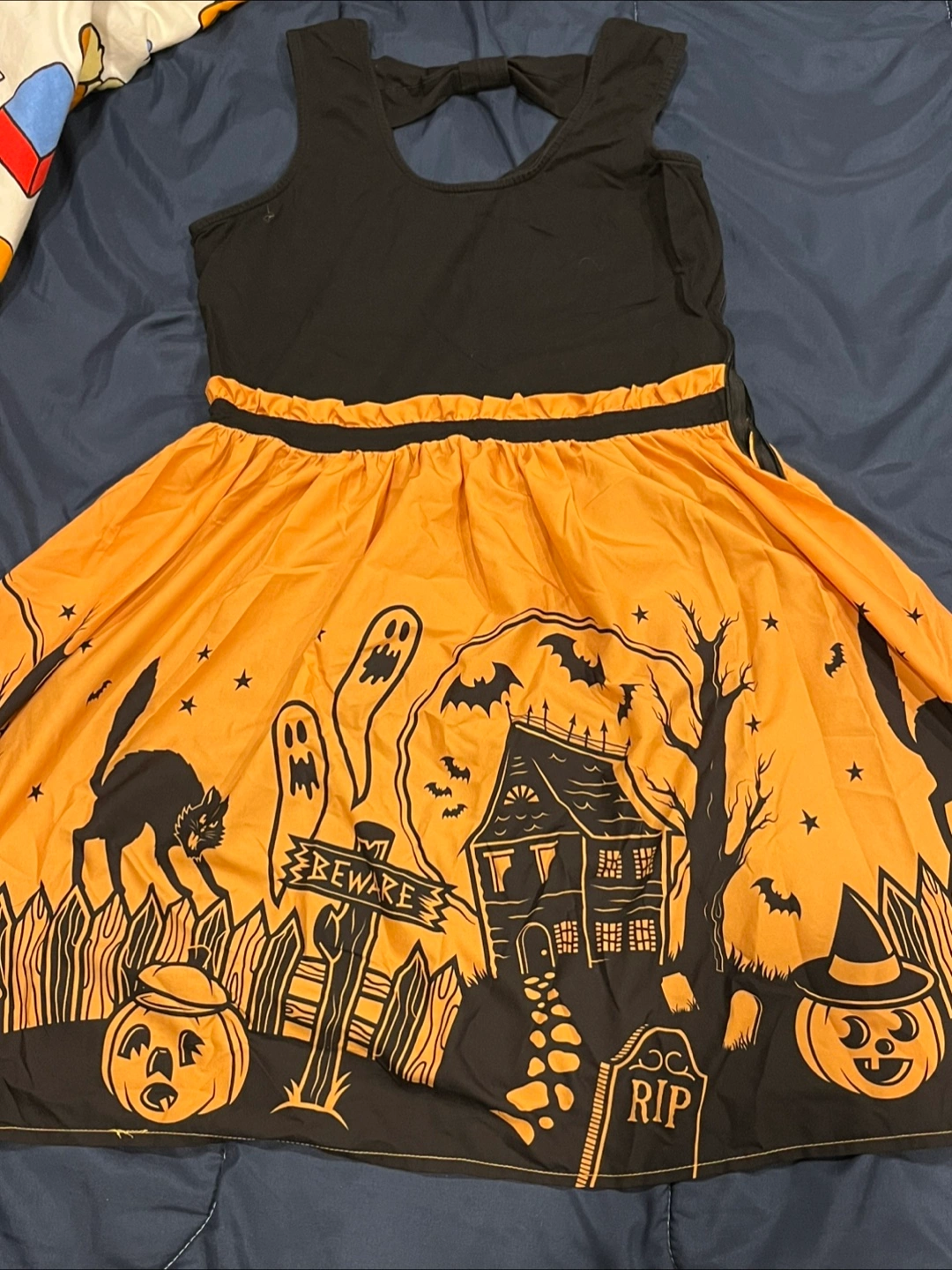 A fun Sourpuss dress. Features a black top. Orange skirt with Halloween-themed print. A great addition for any Halloween event to show off your spooky spirit.