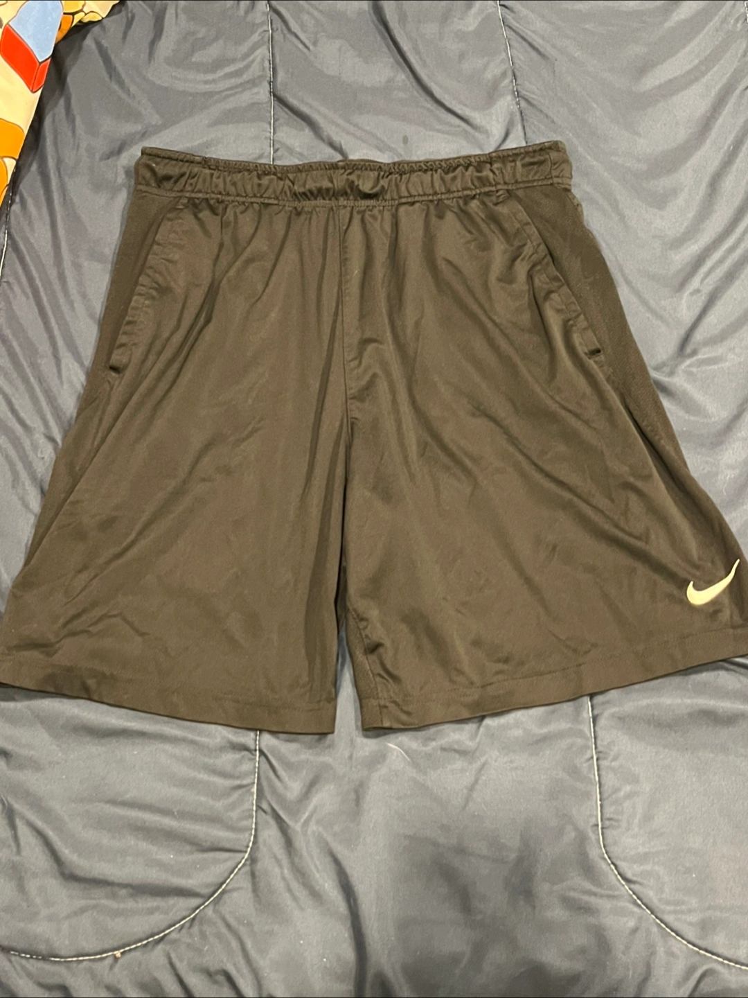 Black athletic shorts. Feature a Dri-FIT design. Includes an elastic waistband. Ideal for workouts. The shorts would be perfect for a morning jog.