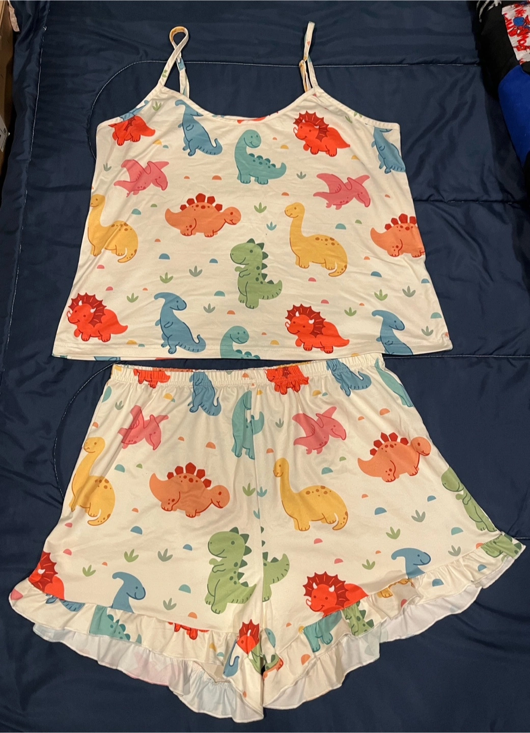 Adorable pajama set, featuring a top and shorts. Colorful dinosaur print all over. Perfect to have a peaceful night's sleep.