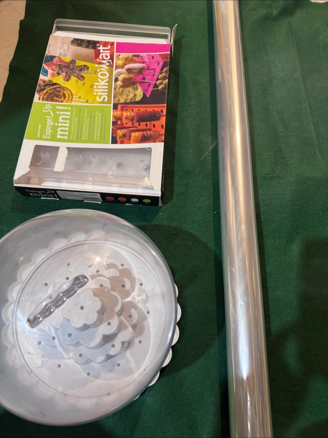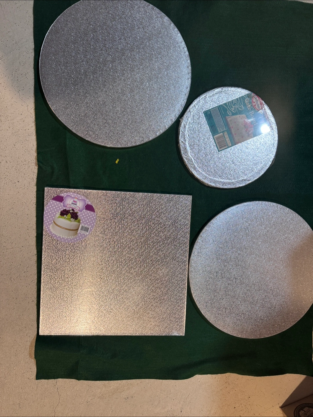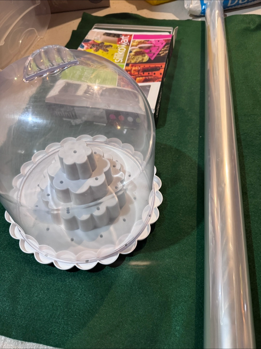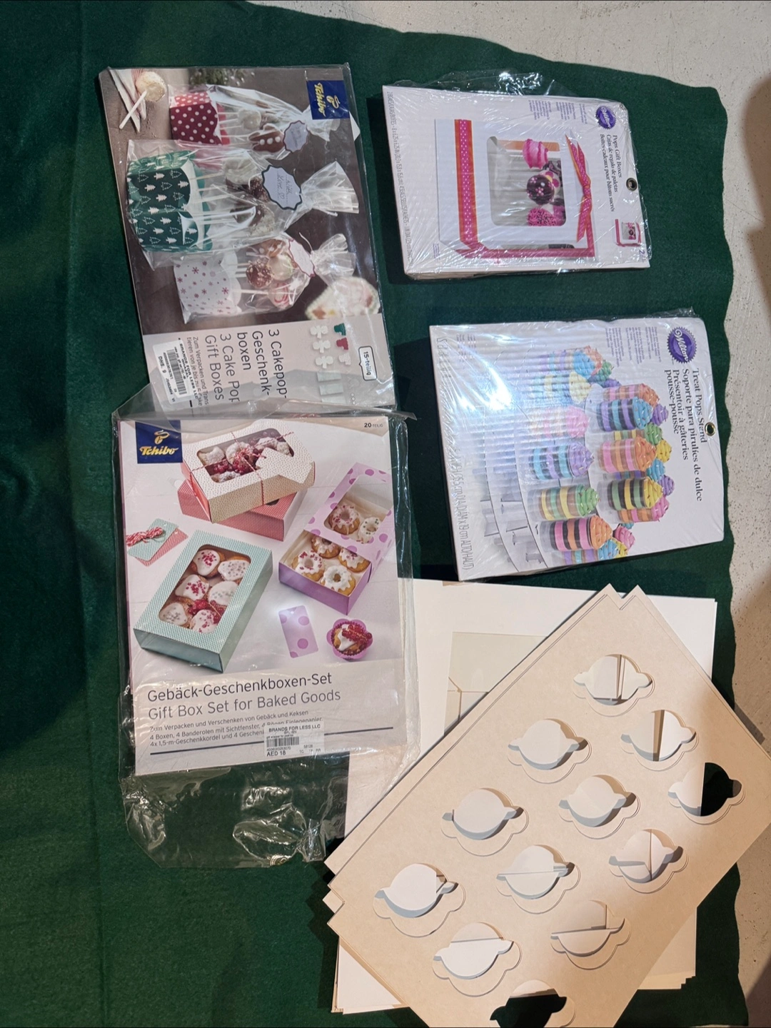 Cake stand with a clear lid. Round and square cake boards, along with some cellophane. Several cake pop boxes and packaging. You could host a delightful afternoon tea with this.